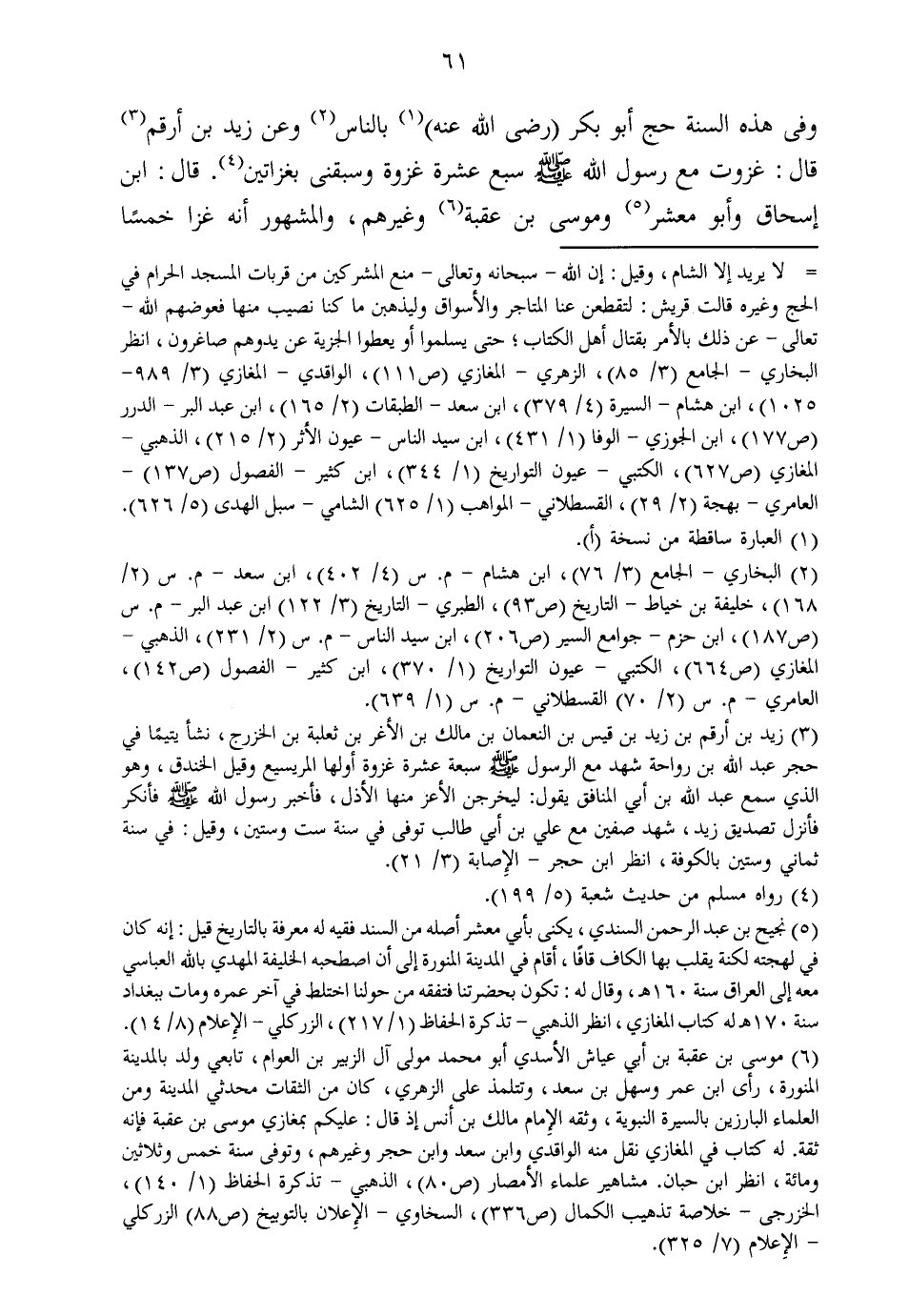 وَفِي هَذِه السّنة حج أَبُو بكر رَضِي الله عَنهُ بِالنَّاسِ وَعَن زيد بن أَرقم قَالَ غزوت مَعَ رَسُول الله صلى الله عَلَيْهِ وَسلم سبع عشرَة غَزْوَة وسبقني بغزاتين قَالَ ابْن إِسْحَاق وَأَبُو معشر ومُوسَى بن عقبَة وَغَيرهم وَالْمَشْهُور أَنه غزا خمْسا