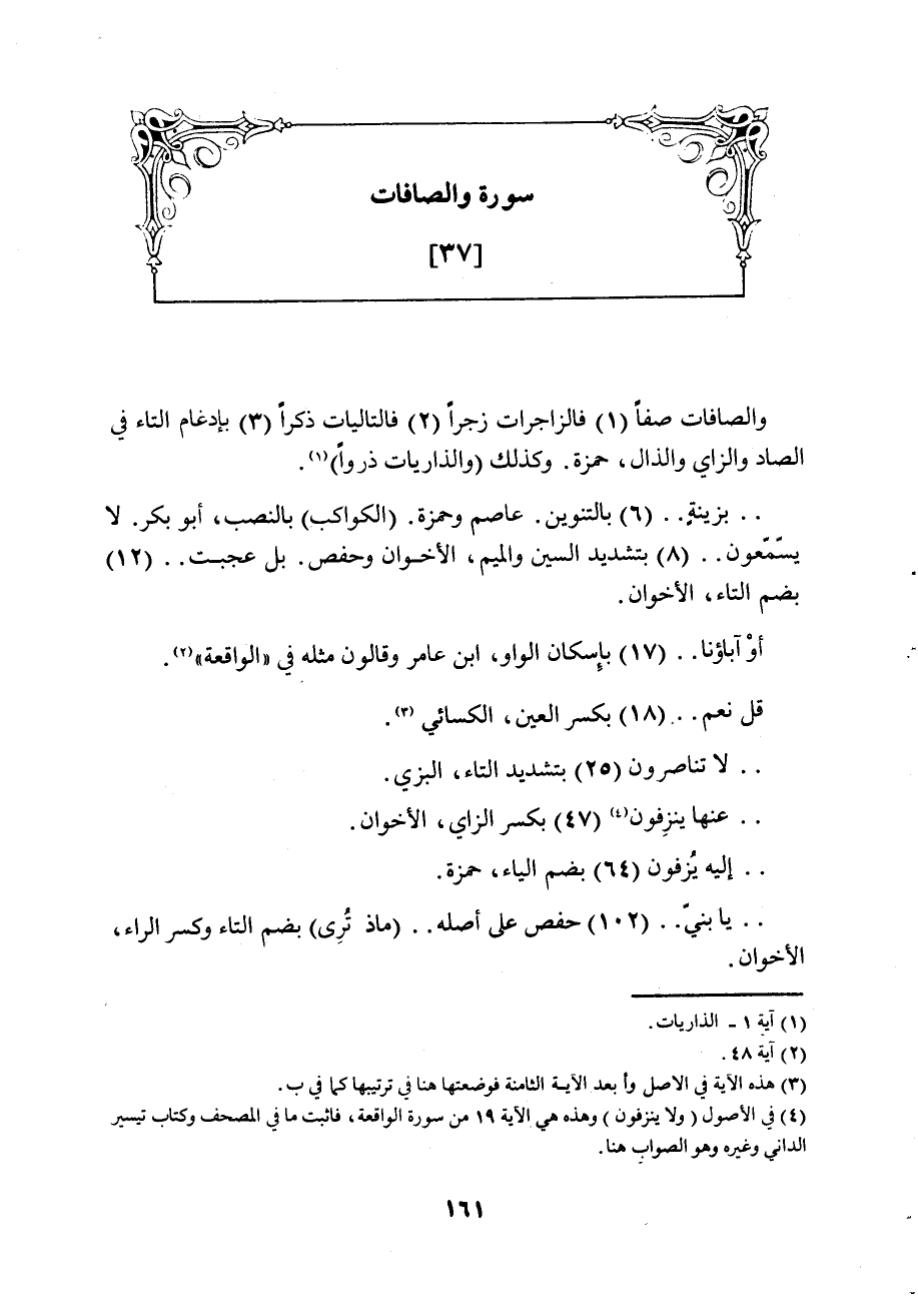 (بزينةٍ) 6 بالتنوين. عاصم وحمزة. (الكواكب) بالنصب، أبو بكر. لا يسّمّعون) 8 بتشديد السين والميم، الأخوان وحفص. (بل عجبت) 12 بضم التاء، الأخوان.