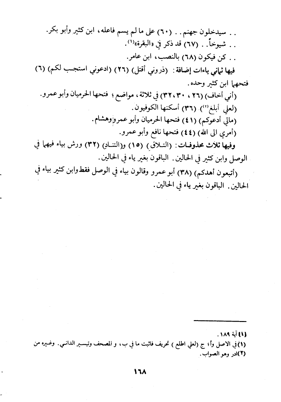 (أتبعون أهدكم) 38 أبو عمرو وقالون بياء في الوصل فقط وابن كثير بياء في الحالين. الباقون بغير ياء في الحالين.