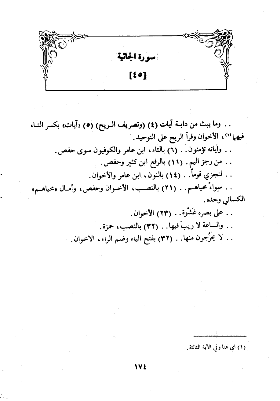 (وما يبث من دابة آيات) 4 (وتصريف الريح) 5 " آيات " بكسر التاء فيهما، الأخوان وقرأ الريح على التوحيد.