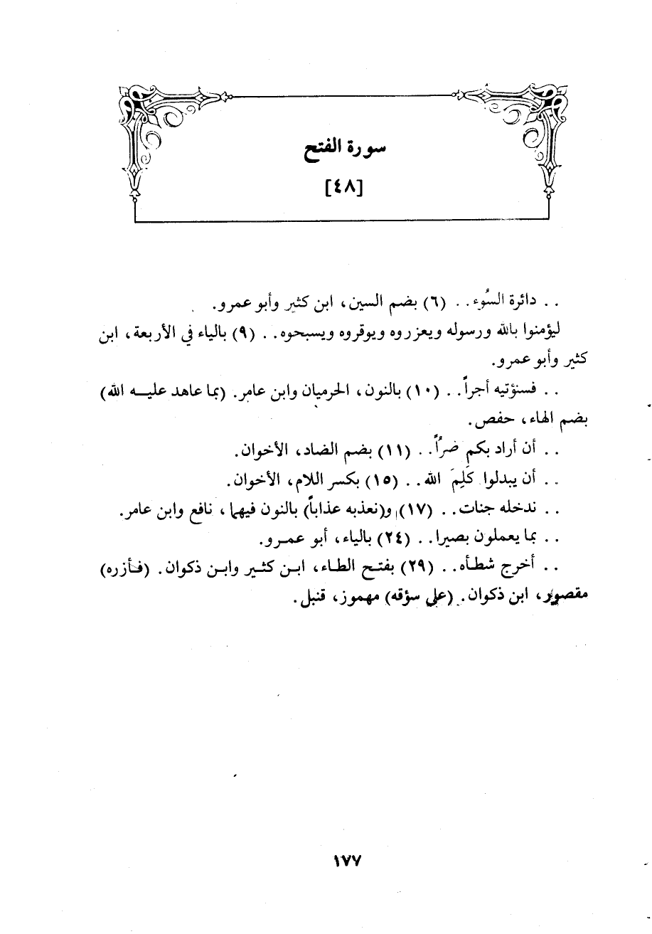 (أخرج شطأه) 29 بفتح الطاء، ابن كثير وابن ذكوان. (فأزره) مقصور، ابن ذكوان (على سوقه) مهموز، قنبل.