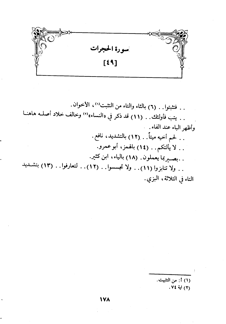 (ولا تنابزوا) 11 (ولا تجسسوا) 12.. لتعارفوا) 13 بتشديد التاء في الثلاثة، البزي.