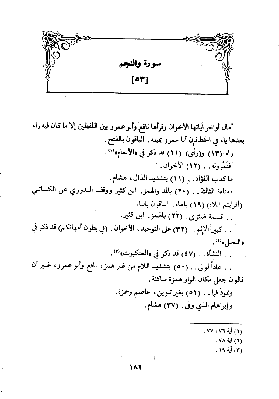 (ومناءة الفؤاد) 20 بالمد والهمز. ابن كثير ووقف الدوري عن الكسائي (أفرأيتم اللاه) 19 بالهاء، الباقون بالتاء.