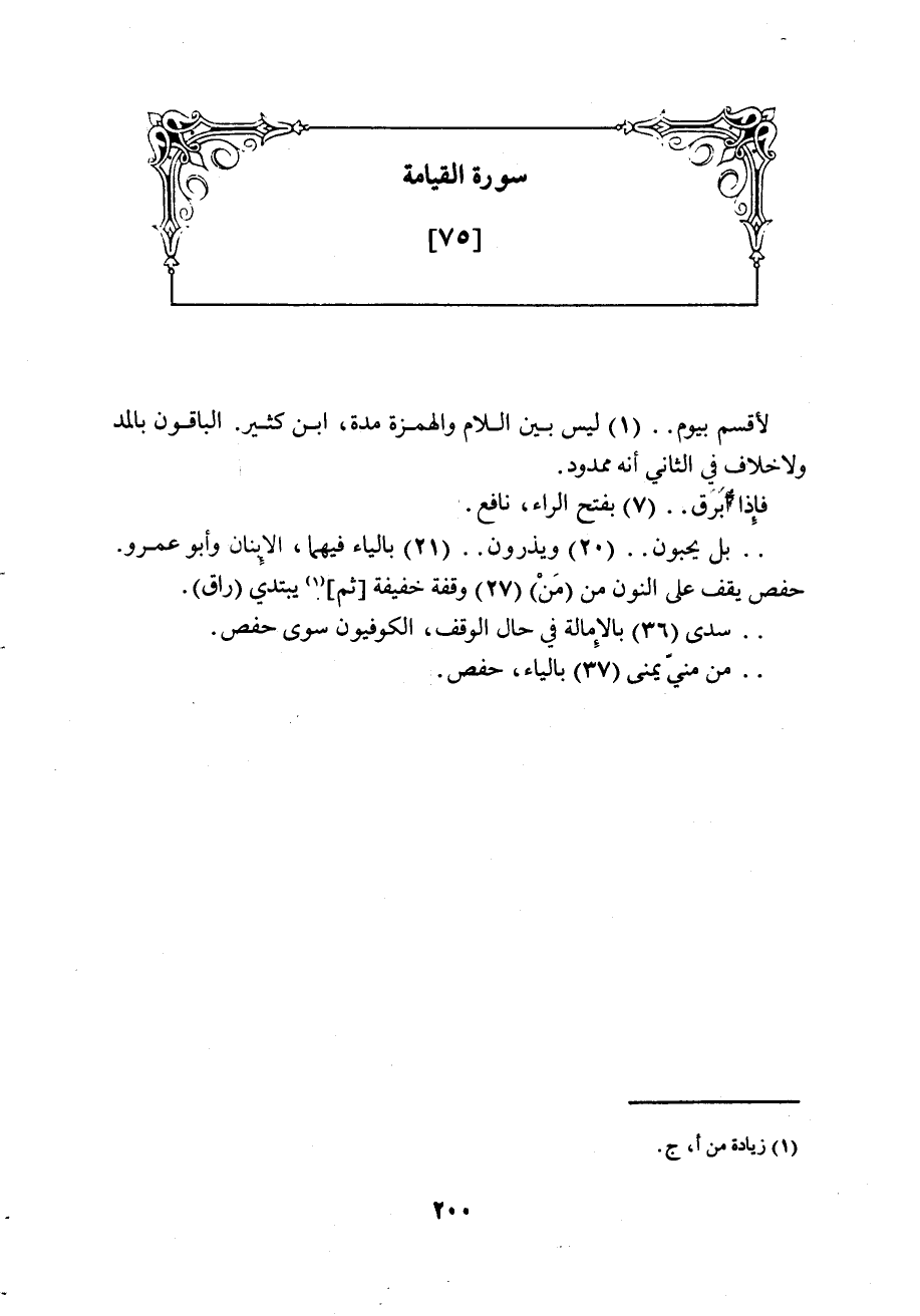 (لأقسم بيوم) 1 ليس بين اللام والهمزة مدة، ابن كثير. الباقون بالمد ولا خلاف في الثاني أنه ممدود.