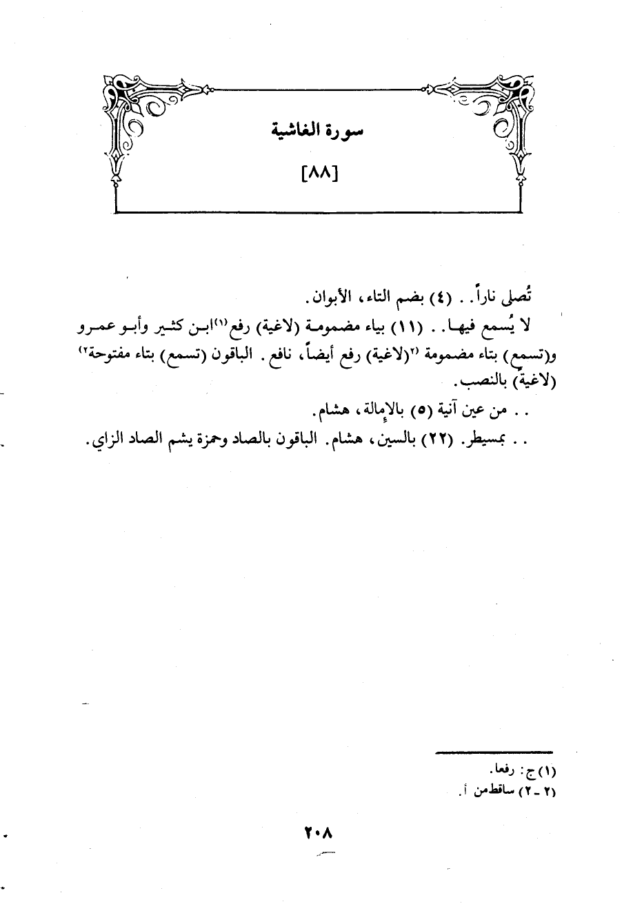 (لا يُسمع فيها) 11 بياء مضمومة (لاغية) رفع ابن كثير وأبو عمرو و (تسمع) بتاء مضمومة (لاغية) رفع أيضا، نافع. الباقون (تسمع) بتاء مفتوحة (لاغية) بالنصب.