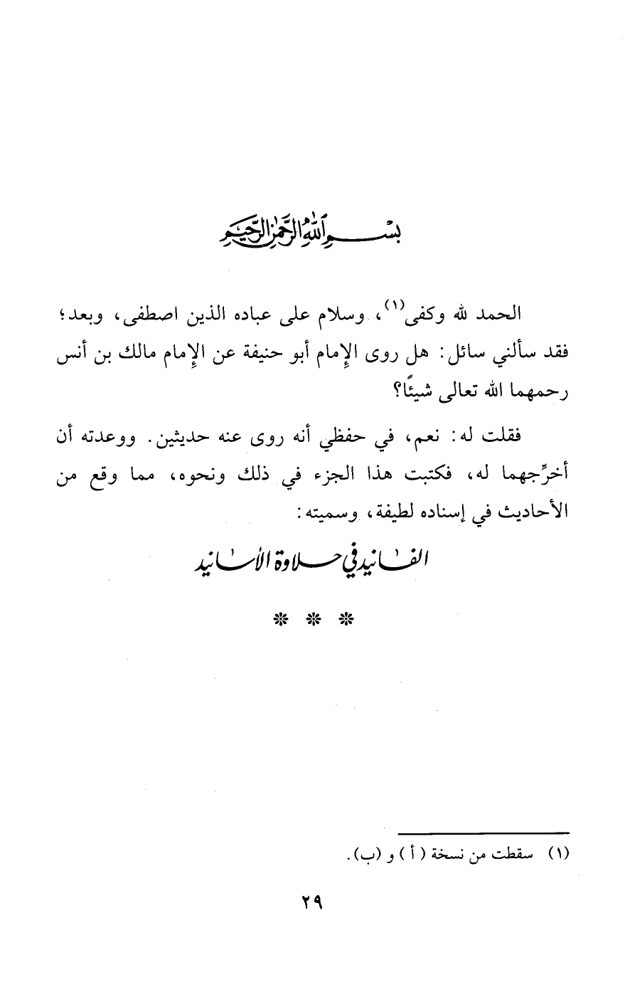 الحمد لله وكفى (¬1)، وسلام على عباده الذين اصطفى، وبعد؛ فقد سألني سائل: هل روى الإِمام أبو حنيفة عن الإِمام مالك بن أنس رحمهما الله تعالى شيئًا؟