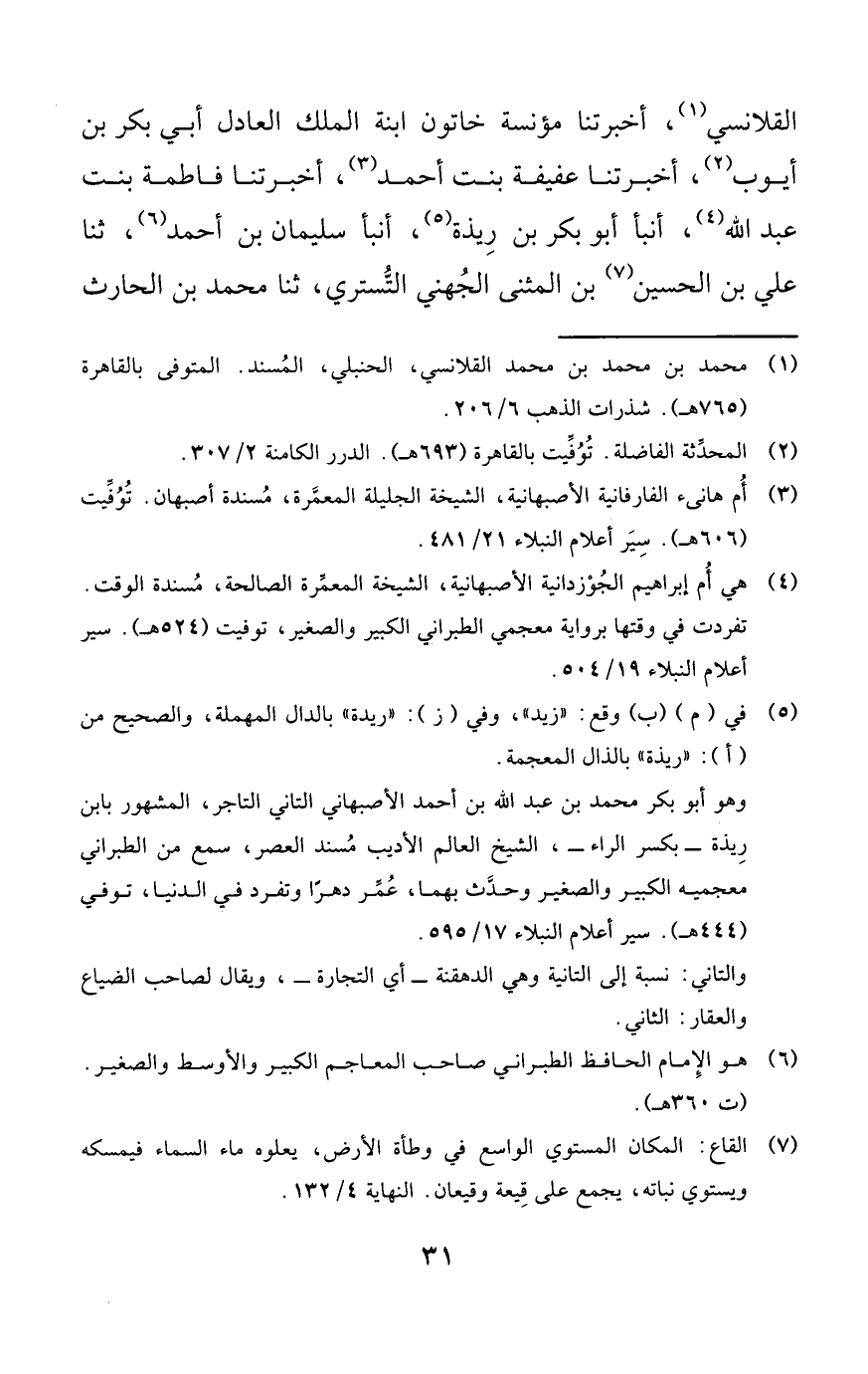 القلانسي (¬1)، أخبرتنا مؤنسة خاتون ابنة الملك العادل أبي بكر بن أيوب (¬2)، أخبرتنا عفيفة بنت أحمد (¬3)، أخبرتنا فاطمة بنت عبد الله (¬4)، أنبأ أبو بكر بن رِيذة (¬5)، أنبأ سليمان بن أحمد (¬6)، ثنا علي بن الحسين (¬7) بن المثنى الجُهني التُّستري، ثنا محمَّد بن الحارث