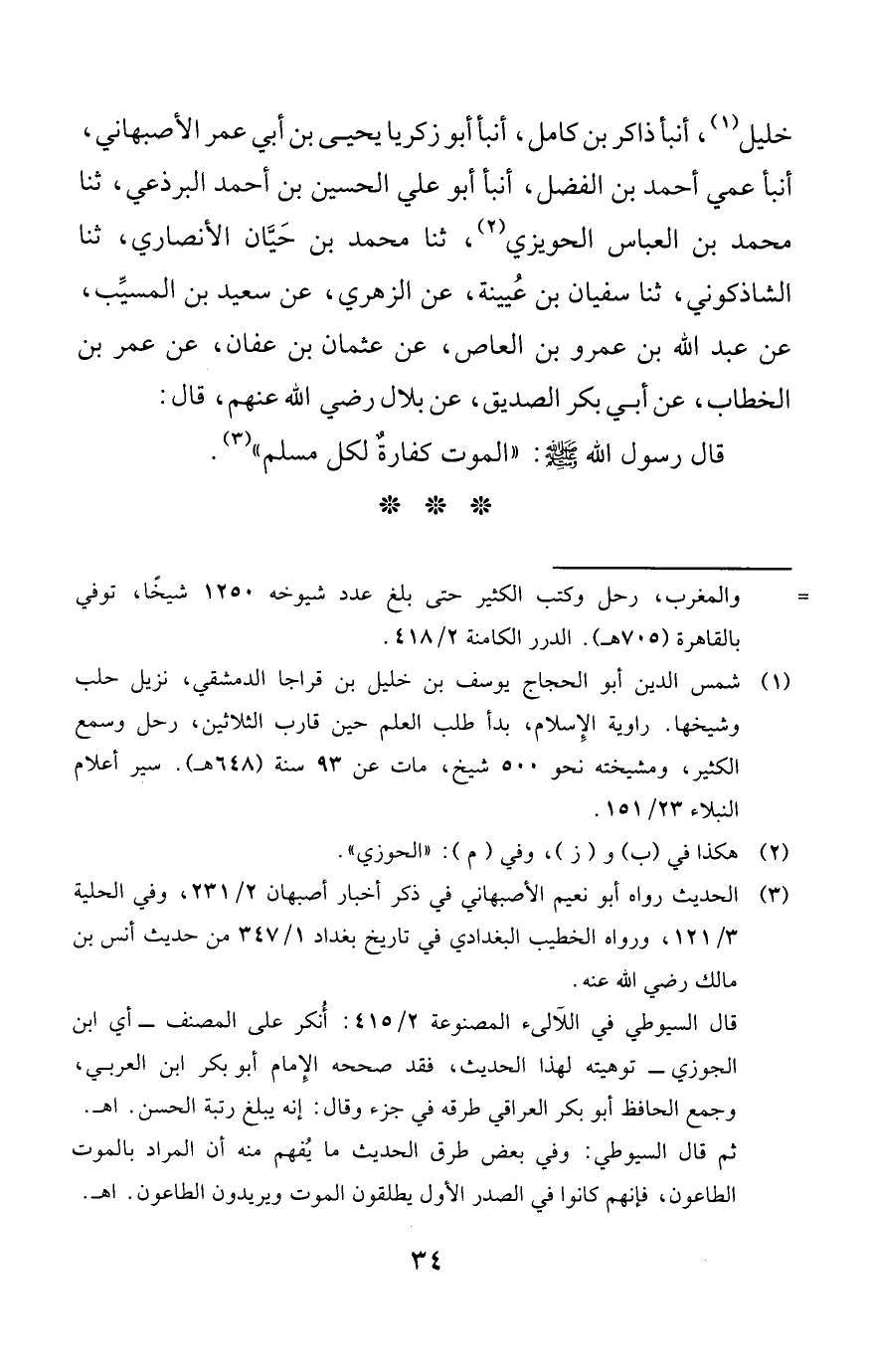 خليل (¬1)، أنبأ ذاكر بن كامل، أنبأ أبو زكريا يحيى بن أبي عمر الأصبهاني، أنبأ عمي أحمد بن الفضل، أنبأ أبو علي الحسين بن أحمد البرذعي، ثنا محمَّد بن العباس الحويزي (¬2)، ثنا محمَّد بن حَيَّان الأنصاري، ثنا الشاذكوني، ثنا سفيان بن عُيينة، عن الزهري، عن سعيد بن المسيِّب، عن عبد الله بن عمرو بن العاص، عن عثمان بن عفان، عن عمر بن الخطاب، عن أبي بكر الصديق، عن بلال رضي الله عنهم، قال: قال رسول الله - صلى الله عليه وسلم -: "الموت كفارةٌ لكل مسلم" (¬3).