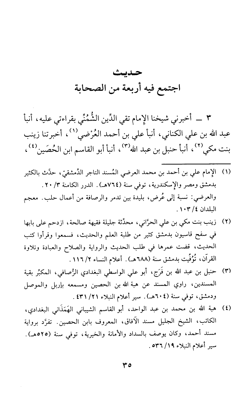 3 - أخبرني شيخنا الإِمام تقي الدِّين الشُّمُنِّي بقراءتي عليه، أنبأ عبد الله بن علي الكناني، أنبأ علي بن أحمد العُرْضي (¬1)، أخبرتنا زينب بنت مكي (¬2)، أنبأ حنبل بن عبد الله (¬3)، أنبأ أبو القاسم ابن الحُصَين (¬4)،