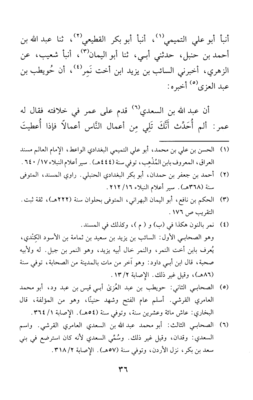 أنبأ أبو علي التميمي (¬1)، أنبأ أبو بكر القطيعي (¬2) ثنا عبد الله بن أحمد بن حنبل، حدثني أبي، ثنا أبو اليمان (¬3)، أنبأ شعيب, عن الزهري، أخبرني السائب بن يزيد ابن أخت نَمِر (¬4) أن حُويطب بن عبد العزى (¬5) أخبره: