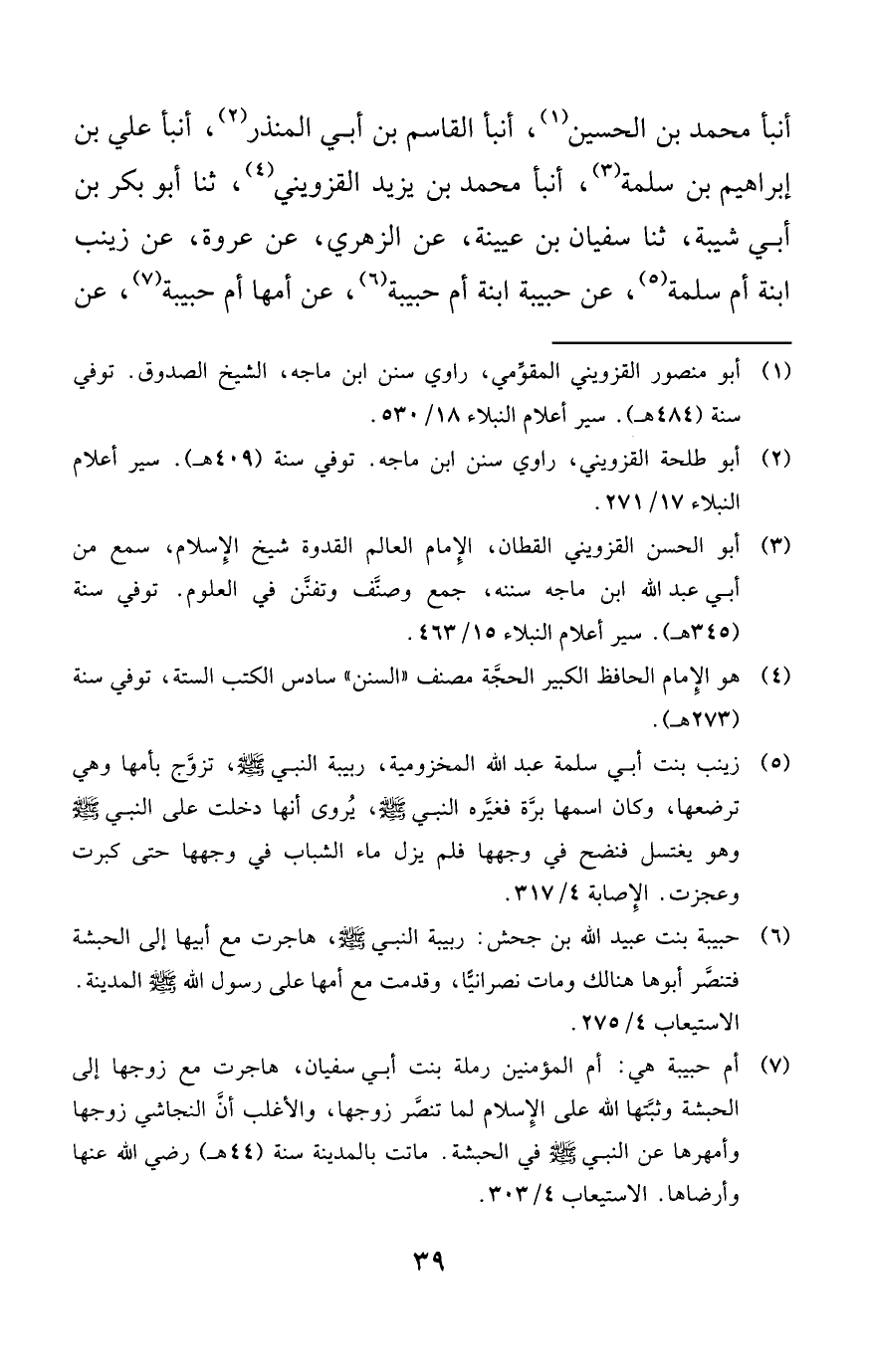 أنبأ محمَّد بن الحسين (¬1)، أنبأ القاسم بن أبي المنذر (¬2)، أنبأ علي بن إبراهيم بن سلمة (¬3)، أنبأ محمَّد بن يزيد القزويني (¬4)، ثنا أبو بكر بن أبي شيبة، ثنا سفيان بن عيينة، عن الزهري، عن عروة، عن زينب ابنة أم سلمة (¬5)، عن حبيبة ابنة أم حبيبة (¬6)، عن أمها أم حبيبة (¬7)، عن