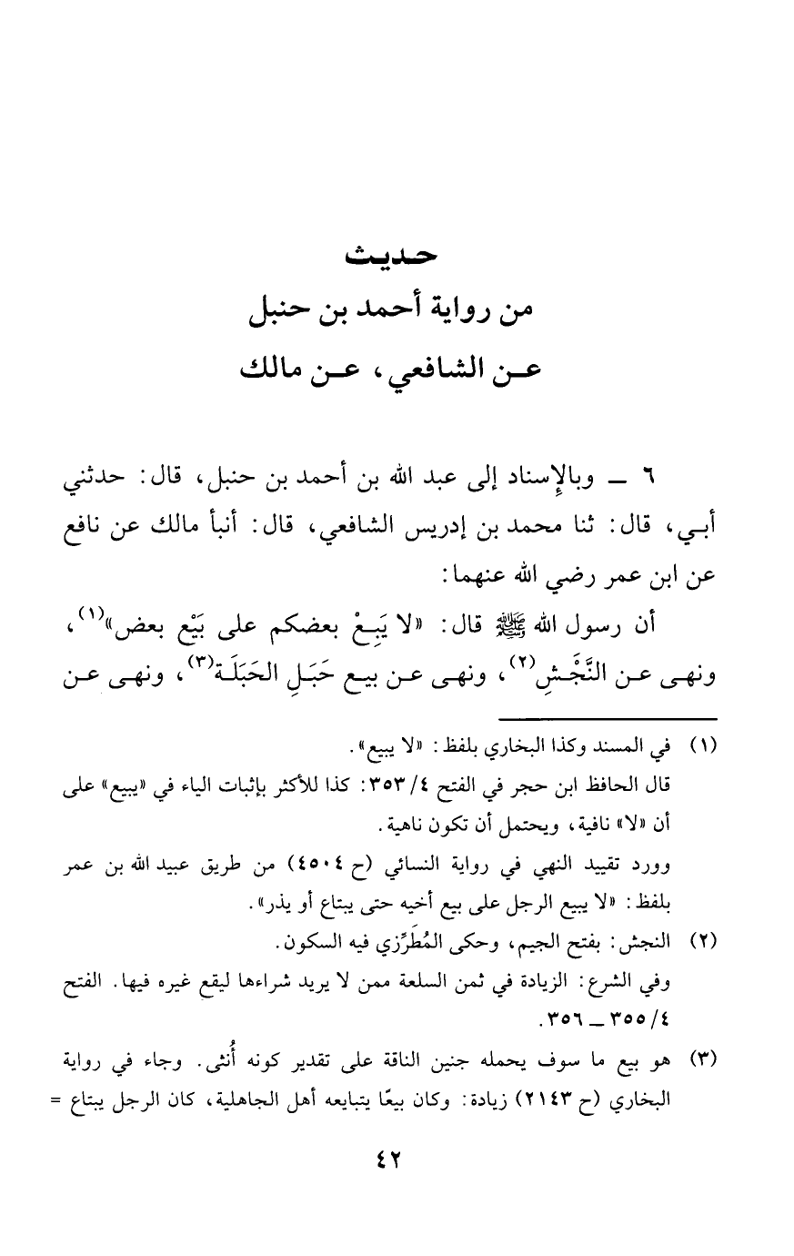 6 - وبالإِسناد إلى عبد الله بن أحمد بن حنبل، قال: حدثني أبي، قال: ثنا محمَّد بن إدريس الشافعي، قال: أنبأ مالك عن نافع عن ابن عمر رضي الله عنهما: