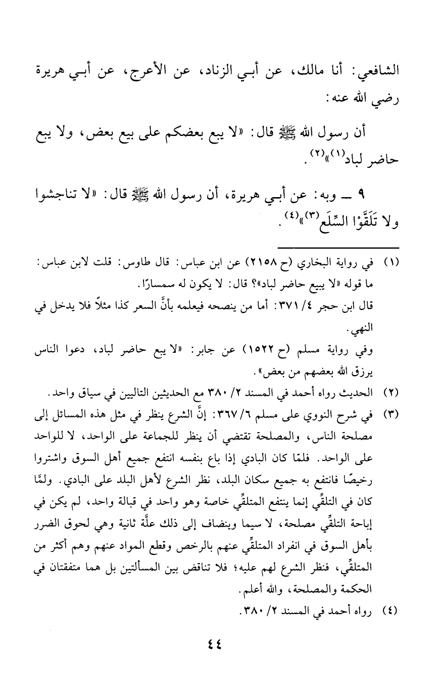 (¬3) في شرح النووي على مسلم 6/ 367: إنَّ الشرع ينظر في مثل هذه المسائل إلى مصلحة الناس، والمصلحة تقتضي أن ينظر للجماعة على الواحد، لا للواحد على الواحد. فلمّا كان البادي إذا باع بنفسه انتفع جميع أهل السوق واشتروا رخيصًا فانتفع به جميع سكان البلد، نظر الشرع لأهل البلد على البادي. ولمَّا كان في التلقِّي إنما ينتفع المتلقِّي خاصة وهو واحد في قبالة واحد، لم يكن في إباحة التلقِّي مصلحة، لا سيما وينضاف إلى ذلك علَّة ثانية وهي لحوق الضرر بأهل السوق في انفراد المتلقِّي عنهم بالرخص وقطع المواد عنهم وهم أكثر من المتلقِّي، فنظر الشرع لهم عليه؛ فلا تناقض بين المسألتين بل هما متفقتان في الحكمة والمصلحة، والله أعلم.