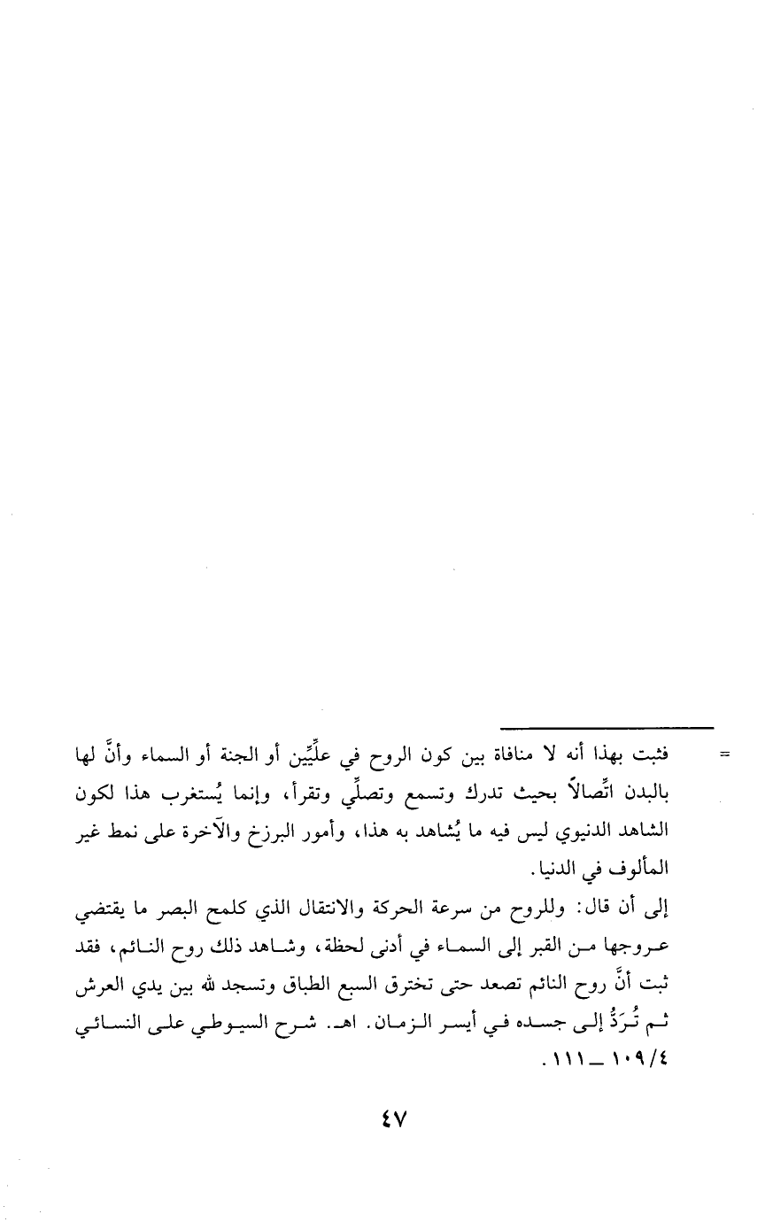إلى أن قال: وللروح من سرعة الحركة والانتقال الذي كلمح البصر ما يقتضي عروجها من القبر إلى السماء في أدنى لحظة، وشاهد ذلك روح النائم، فقد ثبت أنَّ روح النائم تصعد حتى تخترق السبع الطباق وتسجد لله بين يدي العرش ثم تُرَدُّ إلى جسده في أيسر الزمان. اهـ. شرح السيوطي على النسائي 4/ 109 - 111.