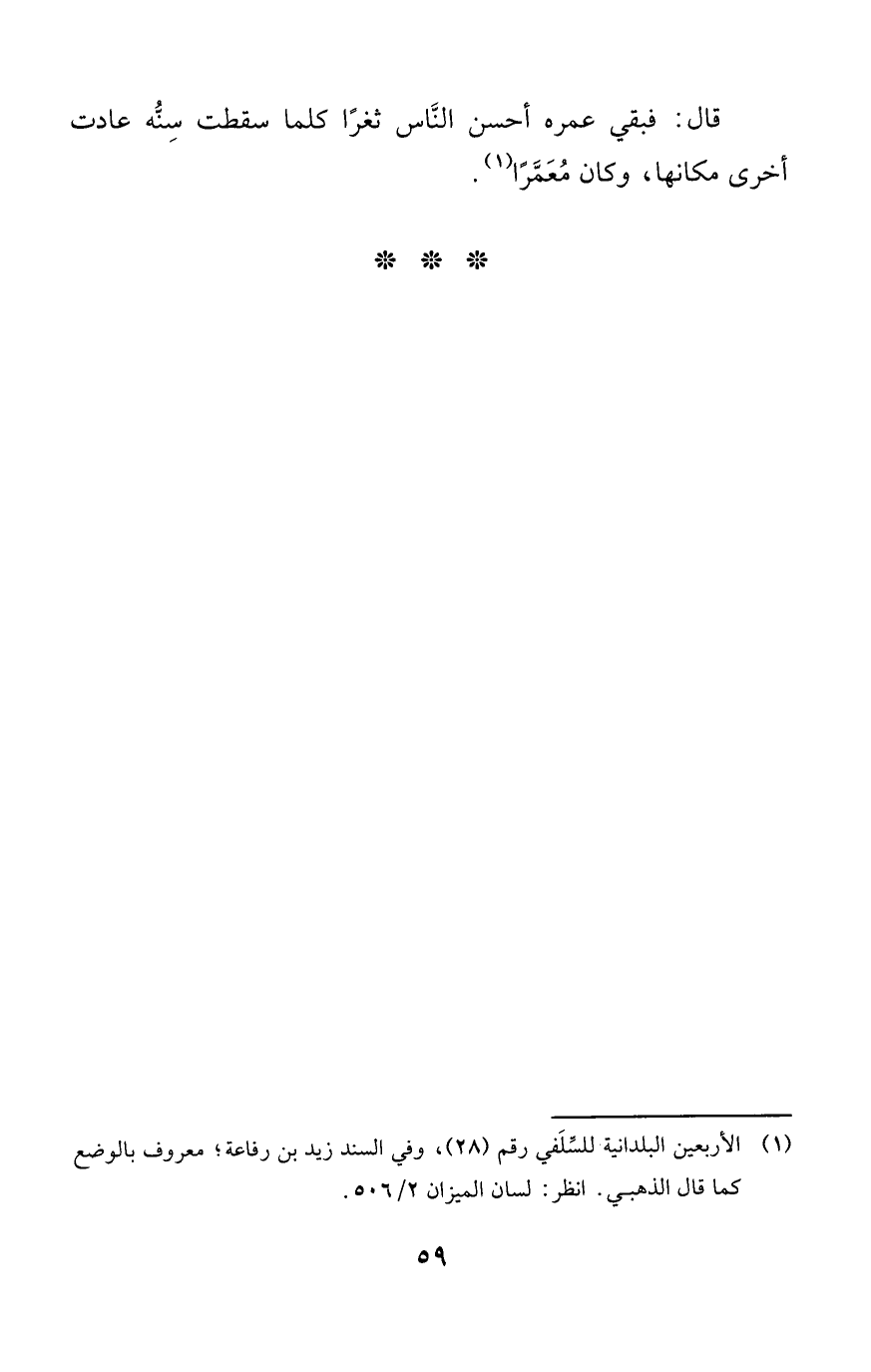 قال: فبقي عمره أحسن النَّاس ثغرًا كلما سقطت سِنُّه عادت أخرى مكانها، وكان مُعَمَّرًا (¬1).