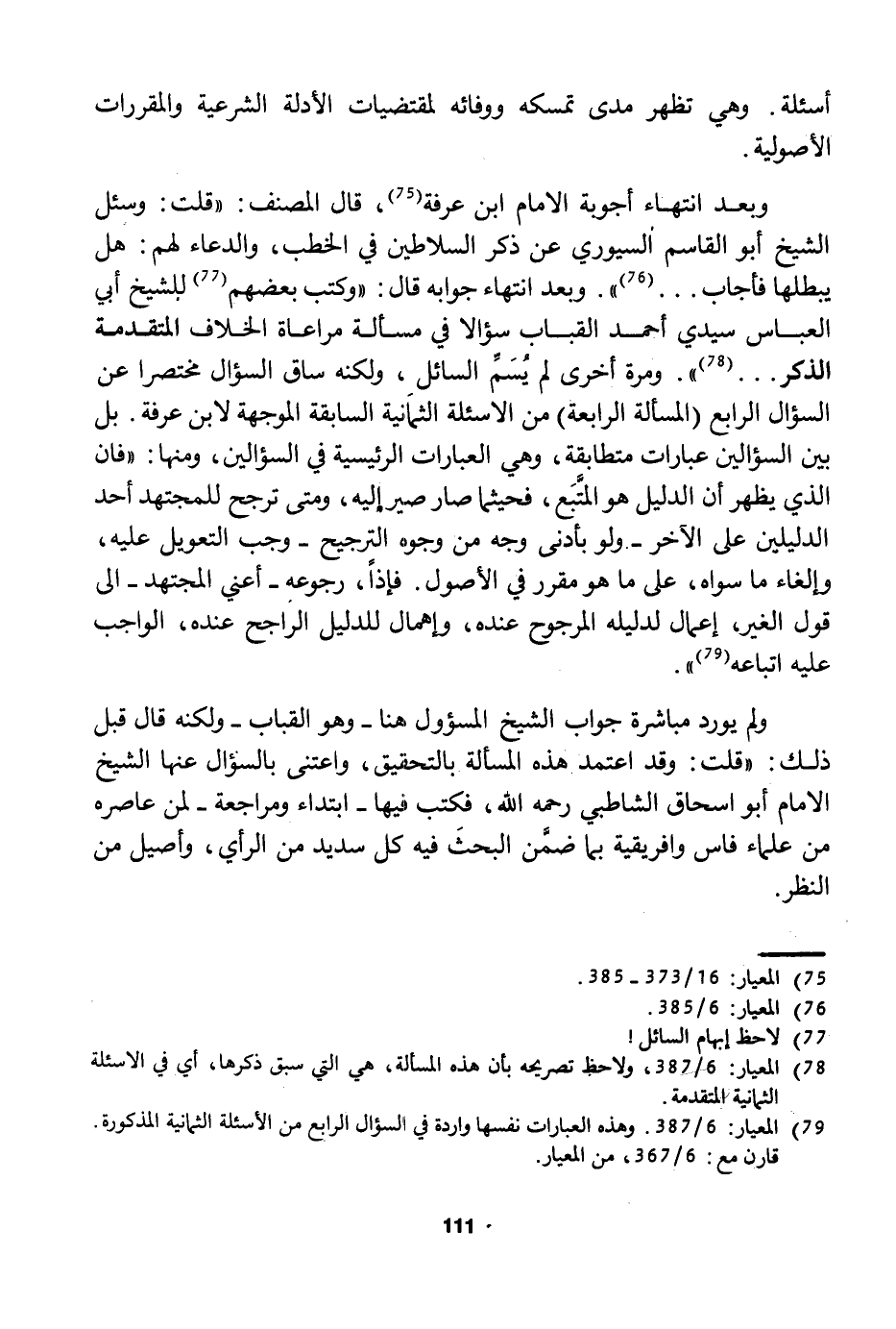 2 وإن كان الذي يبدو أن الونشريسي -وهو بفاس- قد أمكنه الحصول على جواب القباب "الفاسي" وحده. والجواب -كما رأينا- لا يتضمن اسم السائل.