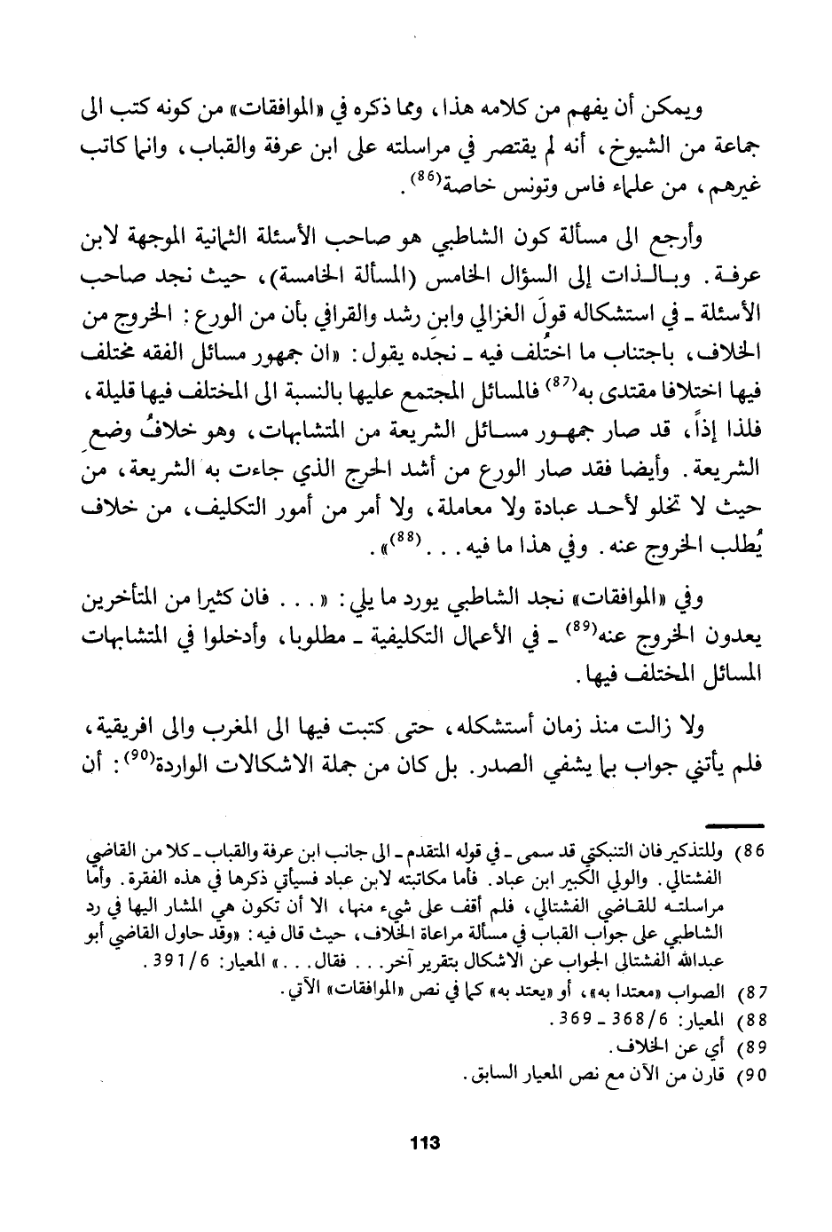 والثاني: يظهر -أيضًا- من قول ابن عباد هذا -كما يظهر من قبل في جواب القباب- وهو أن مراسلة الشاطبي، ليست -فحسب- عبارة عن "سؤال"، وإنما هي مراسلة مطولة، ذات مسائل وفوصل، وأنها تعرض مناظرات كانت جارية بغرناطة، وتعرض حجج الفريقين وآراءهما، وضمنهم الشابطي طبعًا. وأن هذه المراسلة -وهما اثنتان لابن عباد- قد تشعبت قضاياها إلى حد اعتذار المجيبين معًا عن متابعة فصولها، وحتى قال القباب: "فأعرضت عن تتبع الفصول، معترفًا بالتقصير حالا ومالا، اعترافًا حقيقيا3.