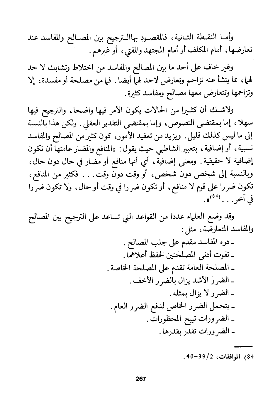 وقد بحث الشاطبي هذه المسألة -بشكل أكثر تفصيلًا- في باب الأوامر والنواهي من كتاب الأحكام، حيث انتهى -بعد حوار شيق طويل- إلى ضرورة احترام ظواهر النصوص وعدم تعطيلها، لكن من غير مغالاة وجمود، ومن غير تنكر للعلل والمصالح الثابتة "فالعمل بالظواهر على تتبع وتغال، بعيد عن مقصود الشارع، كما أن إهمالها إسراف أيضًا.