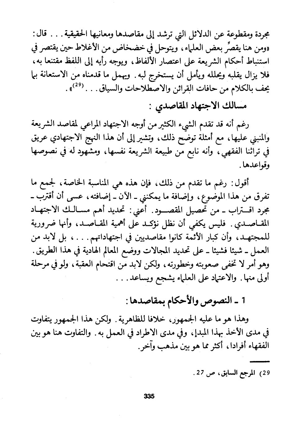 فهذا هو الاجتهاد الحق، وهذا هو الاجتهاد الأكمل، فكل مسألة تعرض، يجب عرضها على الأدلة الجزئية، وعلى الأدلة الكلية والمقاصد العامة للشريعة. والذي يقتصر في اجتهاده وفتواه على ما فهمه من دليل جزئي "آية، أو حديث، أو قياس"، لا يقل اجتهاده قصورًا واختلالًا عمن ألم بشيء من مقاصد الشريعة في حفظها للمصالح الضرورية والحاجية والتحسينية ودرئها للمفاسد، ثم أخذ يفتي ويحكم دون مراجعة ونظر في الأدلة الخاصة لكل مسألة وكل نازلة. فكلاهما قاصر مقصر عن درجة الاجتهاد الأمثل: