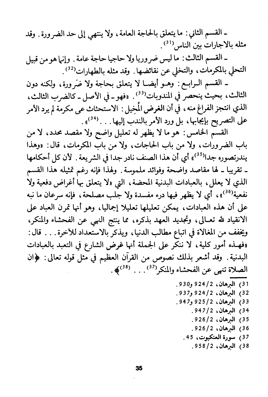 ورغم أنه عندما ذكر هذه الضروريات للمرة الأولى، ذكرها على ترتيب الغزالي، فقال: "المقاصد الخمسة التي لم تخل من رعايتها ملة من الملل، ولا شريعة من الشرائع هي: الدين والنفس، والعقل، والنسل، والمال"1.