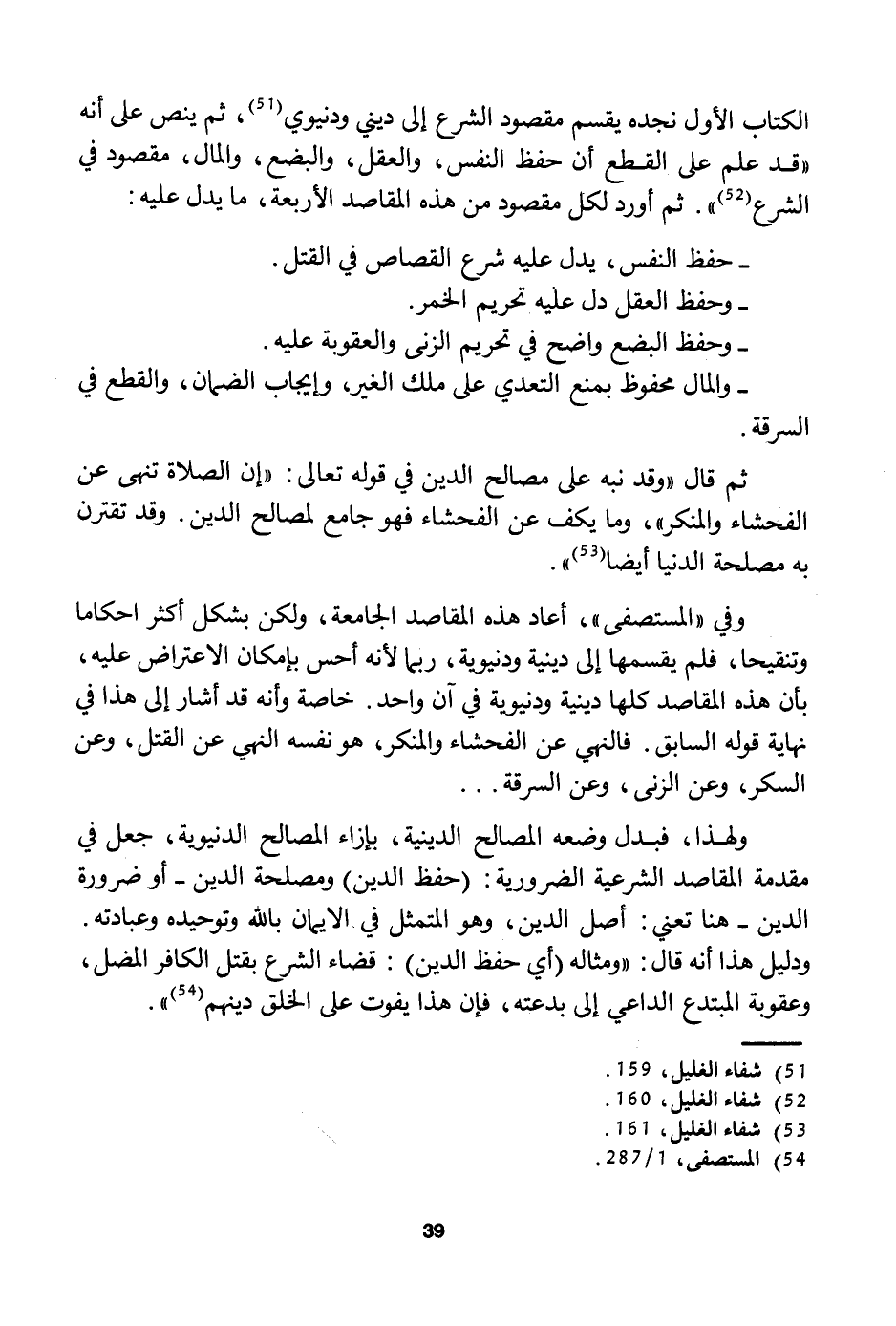 - وأما الدكتور البوطي، فقد تبنى ترتيب الغزالي، وعلله من وجهة نظره، وبنى على ذلك ما بدا له من الأمثلة الفقهية، وكل هذا من حقه، ولا غبار عليه. ولكنه جازف وتكلف عندما قال: "الترتيب بهذا الشكل بين الكليات الخمسة، محل إجماع"1.