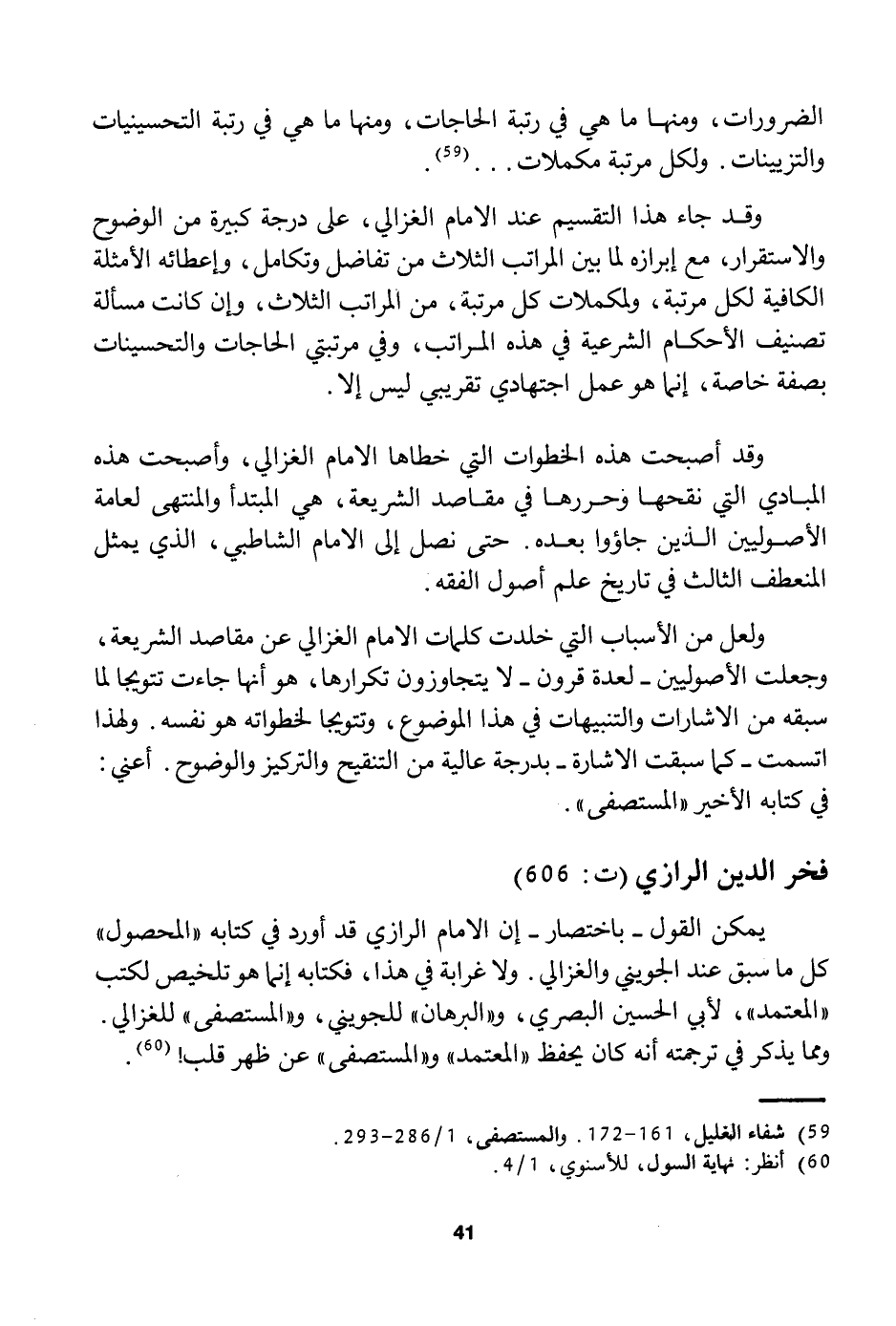 لست أعني الأصوليين الأحناف، لأنهم أقل التفاتا إلى مقاصد الشريعة من المتكلمين. وقد راجعت عددًا من مصنفاتهم، ما بين متقدم ومتأخر، فلم أجد فيها ما يستحق الذكر1. مع أن الفقهاء الحنفية من أكثر الفقهاء تعليلًا لأحكام الشريعة: معاملات وعبادات. والتفاتهم إلى العلل والمقاصد أكثر بكثير من الفقهاء الشافعية. ولكن هذا في الفقه وجزئياته.