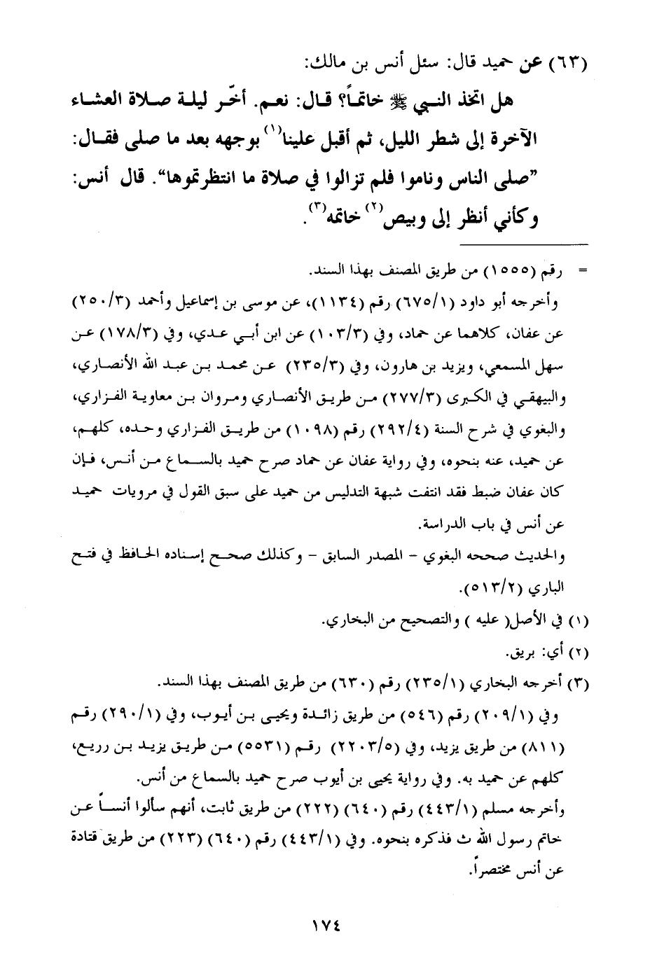 ٦٣ - عَنْ حُمَيْدٍ، قَالَ: سُئِلَ أَنَسُ بْنُ مَالِكٍ: هَلِ اتَّخَذَ النَّبِيُّ صَلَّى اللهُ عَلَيْهِ وَسَلَّمَ خَاتَمًا؟ قَالَ: نَعَمْ أَخَّرَ لَيْلَةً صَلَاةَ الْعِشَاءِ الْآخِرَةِ إِلَى شَطْرِ اللَّيْلِ، ثُمَّ أَقْبَلَ عَلَيْنَا بِوَجْهِهِ بَعْدَ مَا صَلَّى، فَقَالَ: «صَلَّى النَّاسُ وَنَامُوا فَلَمْ تَزَالُوا فِي صَلَاةٍ مَا انْتَظَرْتُمُوهَا» قَالَ أَنَسٌ: وَكَأَنِّي أَنْظُرُ إِلَى وَبِيصِ خَاتَمِهِ