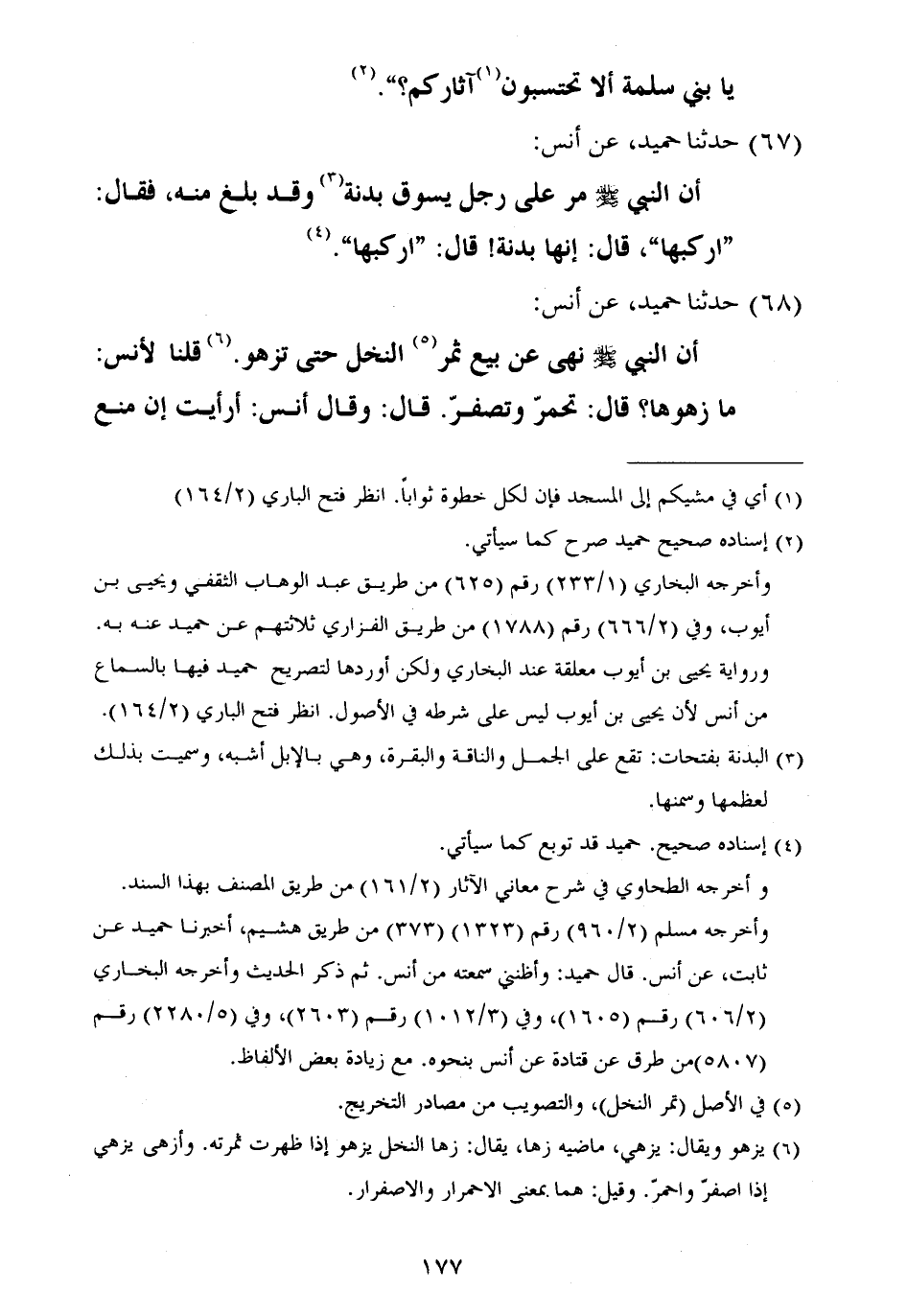 ٦٨ - حَدَّثَنَا حُمَيْدٌ، عَنْ أَنَسٍ أَنَّ النَّبِيَّ صَلَّى اللهُ عَلَيْهِ وَسَلَّمَ نَهَى عَنْ بَيْعِ ثَمَرِ النَّخْلِ حَتَّى تَزْهُوَ، قُلْنَا لِأَنَسٍ: مَا زَهْوُهَا؟ قَالَ: «تَحْمَرُّ وَتَصْفَرُّ» قَالَ: وَقَالَ أَنَسٌ: «أَرَأَيْتَ إِنْ مَنَعَ ⦗١٧٨⦘ الثَّمَرَةَ، بِمَ تَسْتَحِلُّ مَالَ أَخِيكَ؟»