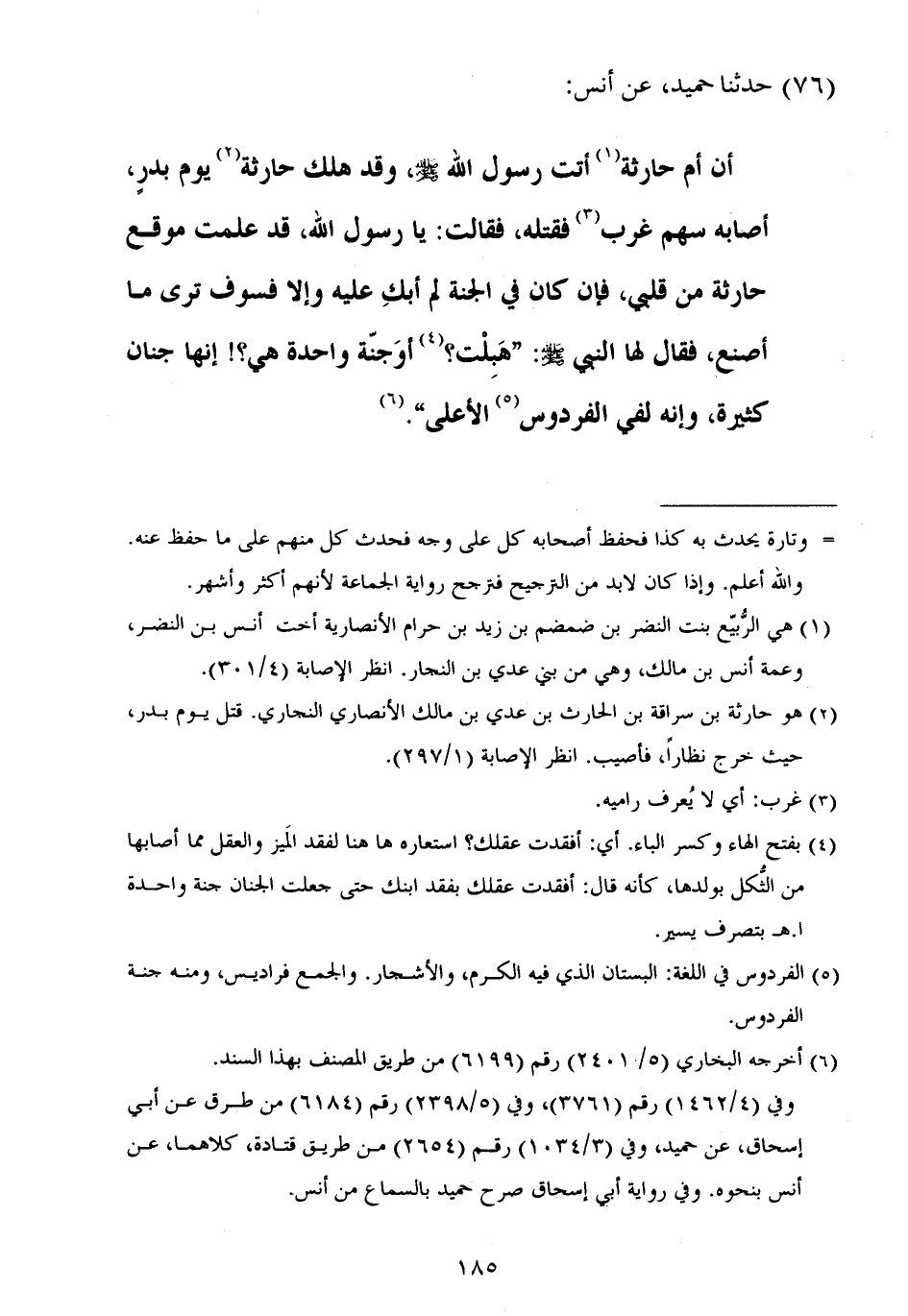 ٧٦ - حَدَّثَنَا حُمَيْدٌ، عَنْ أَنَسٍ أَنَّ أُمَّ حَارِثَةَ أَتَتْ رَسُولَ اللَّهِ صَلَّى اللهُ عَلَيْهِ وَسَلَّمَ، وَقَدْ هَلَكَ حَارِثَةُ يَوْمَ بَدْرٍ، أَصَابَهُ سَهْمُ غَرْبٌ فَقَتَلَهُ، فَقَالَتْ: يَا رَسُولَ اللَّهِ، قَدْ عَلِمْتَ مَوْقِعَ حَارِثَةَ مِنْ قَلْبِي، فَإِنْ كَانَ فِي الْجَنَّةِ لَمْ أَبِكِ عَلَيْهِ، وَإِلَّا فَسَوْفَ تَرَى مَا أَصْنَعُ، فَقَالَ لَهَا النَّبِيُّ صَلَّى اللهُ عَلَيْهِ وَسَلَّمَ: «هَبِلْتِ؟ أَوَ جَنَّةٌ وَاحِدَةٌ هِيَ؟ إِنَّهَا جِنَانٌ كَثِيرَةٌ، وَإِنَّهُ لَفِي الْفِرْدَوْسِ الْأَعْلَى»