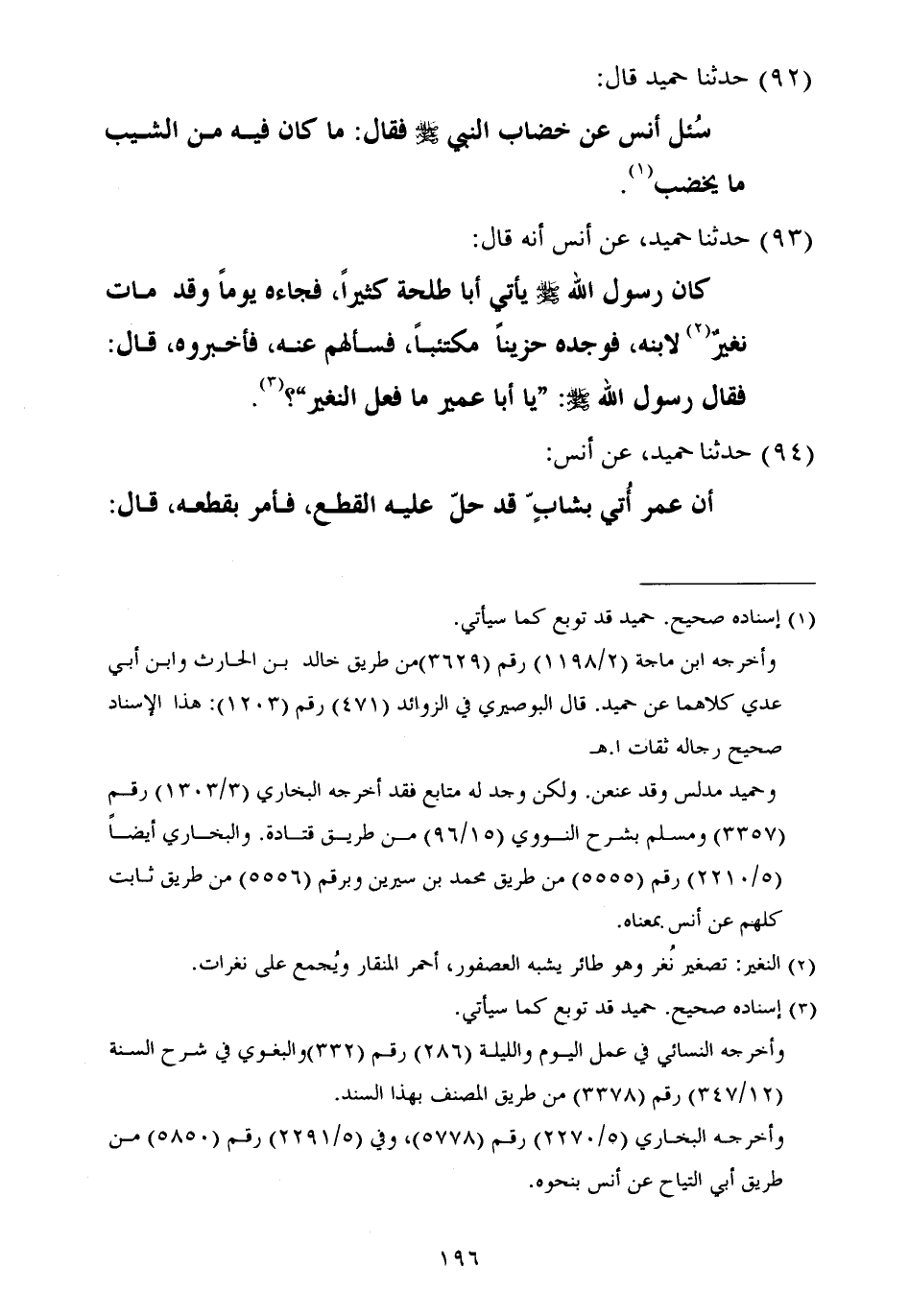 ٩٣ - حَدَّثَنَا حُمَيْدٌ، عَنْ أَنَسٍ أَنَّهُ قَالَ: كَانَ رَسُولُ اللَّهِ صَلَّى اللهُ عَلَيْهِ وَسَلَّمَ يَأْتِي أَبَا طَلْحَةَ كَثِيرًا، فَجَاءَهُ يَوْمًا وَقَدْ مَاتَ نُغِيرٌ لِابْنِهِ، فَوَجَدَهُ حَزِينًا مُكْتَئِبًا، فَسَأَلَهُمْ عَنْهُ، فَأَخْبَرُوهُ، قَالَ: فَقَالَ رَسُولُ اللَّهِ صَلَّى اللهُ عَلَيْهِ وَسَلَّمَ: «يَا أَبَا عُمَيْرٍ مَا فَعَلَ النُّغَيْرُ؟»