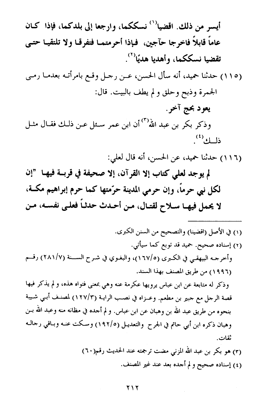 ١١٦ - حَدَّثَنَا حُمَيْدٌ، عَنِ الْحَسَنِ أَنَّهُ قَالَ لِعَلِيٍّ: لَمْ يُوجَدْ لِعَلِيٍّ كِتَابٌ إِلَّا الْقُرْآنُ، إِلَّا صَحِيفَةٌ فِي قِرْبَةٍ فِيهَا «إِنَّ لِكُلِّ نَبِيٍّ حَرَمًا، وَإِنَّ حَرَمِي الْمَدِينَةُ حَرَّمْتُهَا كَمَا حَرَّمَ إِبْرَاهِيمُ مَكَّةَ، لَا يُحْمَلُ فِيهَا سِلَاحٌ لِقِتَالٍ، مَنْ أَحْدَثَ حَدَثًا فَعَلَى نَفْسِهِ، مَنْ ⦗٢١٣⦘ أَحْدَثَ حَدَثًا، أَوْ آوَى مُحْدِثًا فَعَلَيْهِ لَعْنَةُ اللَّهِ وَالْمَلَائِكَةِ وَالنَّاسِ أَجْمَعِينَ، لَا يُقْبَلُ مِنْهُ صَرْفٌ وَلَا عَدْلٌ، الْمُؤْمِنُونَ يَدٌ عَلَى مَنْ سِوَاهُمْ، تَكَافَأُ دِمَاؤُهُمْ، وَيَسْعَى بِذِمَّتِهِمْ أَدْنَاهُمْ، لَا يُقْتَلُ مُؤْمِنٌ بِكَافِرٍ وَلَا ذُو عَهْدٍ فِي عَهْدِهِ»