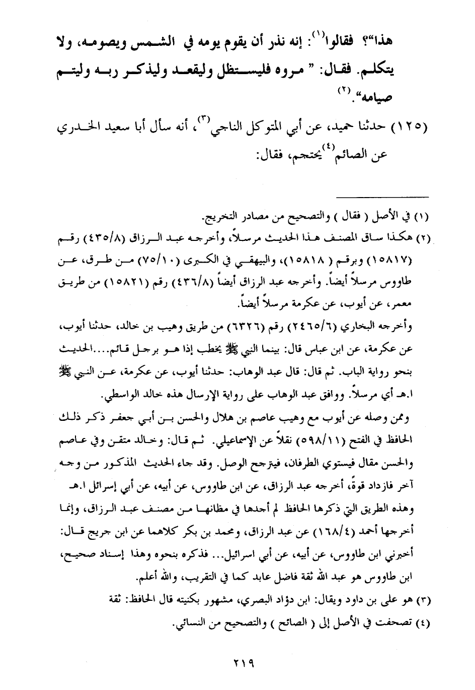 ١٢٥ - حَدَّثَنَا حُمَيْدٌ، عَنْ أَبِي الْمُتَوَكِّلِ النَّاجِيِّ أَنَّهُ سَأَلَ أَبَا سَعِيدٍ الْخُدْرِيَّ عَنِ الصَّائِمِ، يَحْتَجِمُ، فَقَالَ: ⦗٢٢٠⦘ «نَعَمْ لَا بَأْسَ بِهِ»