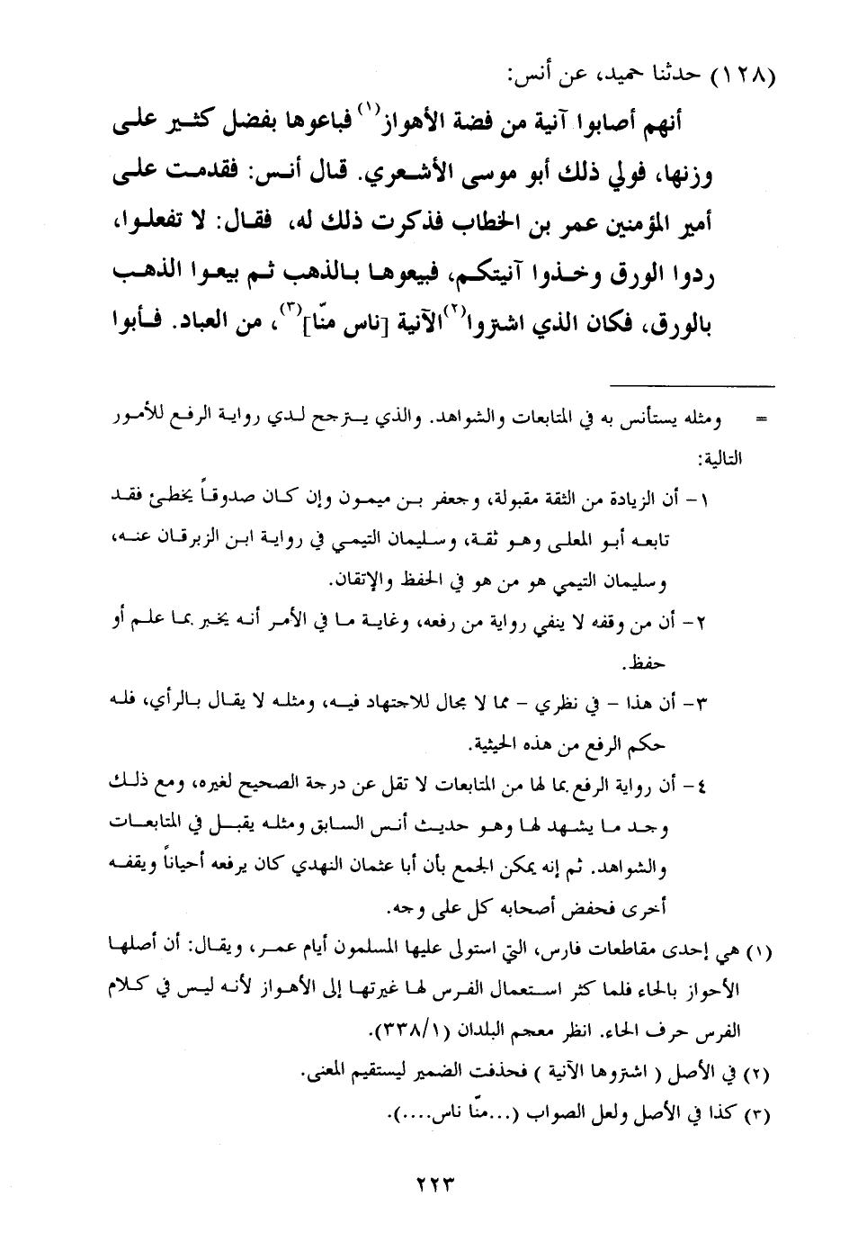 ١٢٨ - حَدَّثَنَا حُمَيْدٌ، عَنْ أَنَسٍ أَنَّهُمْ أَصَابُوا آنِيَةً مِنْ فِضَّةِ الْأَهْوَازِ فَبَاعُوهَا بِفَضْلٍ كَثِيرٍ عَلَى وَزْنِهَا، فَوَلِيَ ذَلِكَ أَبُو مُوسَى الْأَشْعَرِيُّ قَالَ أَنَسٌ: فَقَدِمْتُ عَلَى أَمِيرِ الْمُؤْمِنِينَ عُمَرَ بْنِ الْخَطَّابِ فَذَكَرْتُ ذَلِكَ لَهُ، فَقَالَ: «لَا تَفْعَلُوا، رُدُّوا الْوَرِقَ وَخُذُوا آنِيَتَكُمْ، فَبِيعُوهَا بِالذَّهَبِ، ثُمَّ بِيعُوا الذَّهَبَ بِالْوَرِقِ» فَكَانَ الَّذِي اشْتَرَوُا الْآنِيَةَ نَاسًا مِنَّا، مِنَ الْعُبَّادِ فَأَبَوْا ⦗٢٢٤⦘ أَنْ يَرُدُّوا عَلَيْنَا الْآنِيَةَ، فَرَدَدْنَا عَلَيْهِمْ فَضْلَ مَا بَيْنَ الْوَزْنَيْنِ