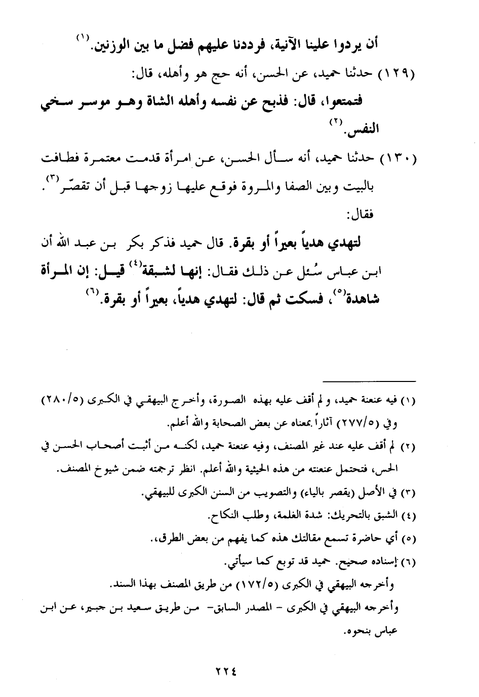١٣٠ - حَدَّثَنَا حُمَيْدٌ أَنَّهُ سَأَلَ الْحَسَنَ عَنِ امْرَأَةٍ قَدِمَتْ مُعْتَمِرَةً فَطَافَتْ بِالْبَيْتِ، وَبَيْنَ الصَّفَا وَالْمَرْوَةِ، فَوَقَعَ عَلَيْهَا زَوْجُهَا قَبْلَ أَنْ تُقَصِّرَ فَقَالَ: «لِتُهْدِي هَدْيًا بَعِيرًا أَوْ بَقَرَةً» . قَالَ حُمَيْدٌ فَذَكَرَ بَكْرُ بْنُ عَبْدِ اللَّهِ أَنَّ ابْنَ عَبَّاسٍ سُئِلَ عَنْ ذَلِكَ، فَقَالَ: «إِنَّهَا لَشَبِقَةٌ» قِيلَ: إِنَّ الْمَرْأَةَ شَاهِدَةٌ، فَسَكَتَ، ثُمَّ قَالَ: «لِتُهْدِي هَدْيًا، بَعِيرًا أَوْ بَقَرَةً»