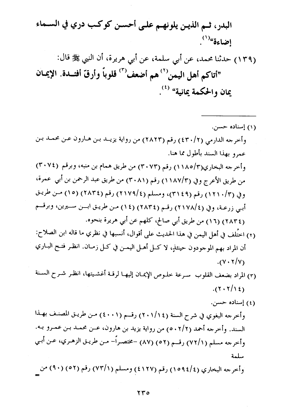 ١٣٩ - حَدَّثَنَا مُحَمَّدٌ، عَنْ أَبِي سَلَمَةَ، عَنْ أَبِي هُرَيْرَةَ أَنَّ النَّبِيَّ صَلَّى اللهُ عَلَيْهِ وَسَلَّمَ قَالَ: «أَتَاكُمْ أَهْلُ الْيَمَنِ هُمْ أَضْعَفُ قُلُوبًا، وَأَرَقُّ أَفْئِدَةً، الْإِيمَانُ يَمَانٍ وَالْحِكْمَةُ يَمَانِيَّةٌ»
