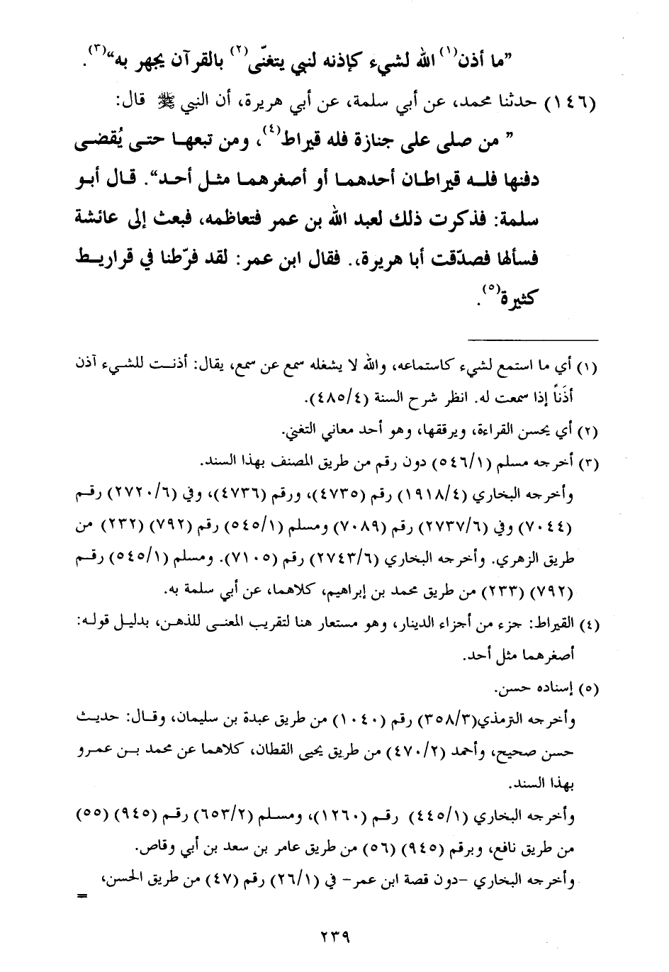 ١٤٦ - حَدَّثَنَا مُحَمَّدٌ، عَنْ أَبِي سَلَمَةَ، عَنْ أَبِي هُرَيْرَةَ أَنَّ النَّبِيَّ صَلَّى اللهُ عَلَيْهِ وَسَلَّمَ قَالَ: «مَنْ صَلَّى عَلَى جِنَازَةٍ فَلَهُ قِيرَاطٌ، وَمَنْ تَبِعَهَا حَتَّى يُقْضَى دَفْنُهَا فَلَهُ قِيرَاطَانِ أَحَدُهُمَا أَوْ أَصْغَرُهُمَا مِثْلُ أُحُدٍ» ، قَالَ أَبُو سَلَمَةَ: فَذَكَرْتُ ذَلِكَ لِعَبْدِ اللَّهِ بْنِ عُمَرَ فَتَعَاظَمَهُ، فَبَعَثَ إِلَى عَائِشَةَ فَسَأَلَهَا فَصَدَّقَتْ أَبَا هُرَيْرَةَ فَقَالَ ابْنُ عُمَرَ: لَقَدْ فَرَّطْنَا فِي قَرَارِيطَ كَثِيرَةٍ