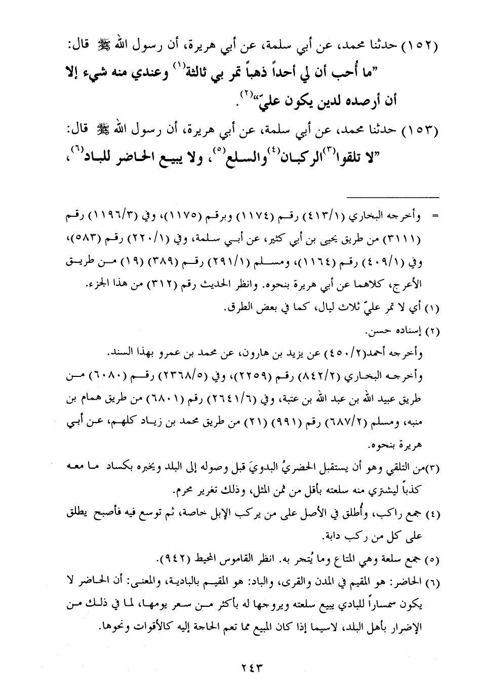 ١٥٣ - حَدَّثَنَا مُحَمَّدٌ، عَنْ أَبِي سَلَمَةَ، عَنْ أَبِي هُرَيْرَةَ أَنَّ رَسُولَ اللَّهِ صَلَّى اللهُ عَلَيْهِ وَسَلَّمَ قَالَ: «لَا تَلَقَّوُا الرُّكْبَانَ وَالسِّلَعَ، وَلَا يَبِعِ الْحَاضِرُ لِلْبَادِ، ⦗٢٤٤⦘ وَلْا تَبَاغَضُوا، وَلَا تَحَاسَدُوا، وَلَا تَنَاجَشُوا، وَكُونُوا عِبَادَ اللَّهِ إِخْوَانًا»