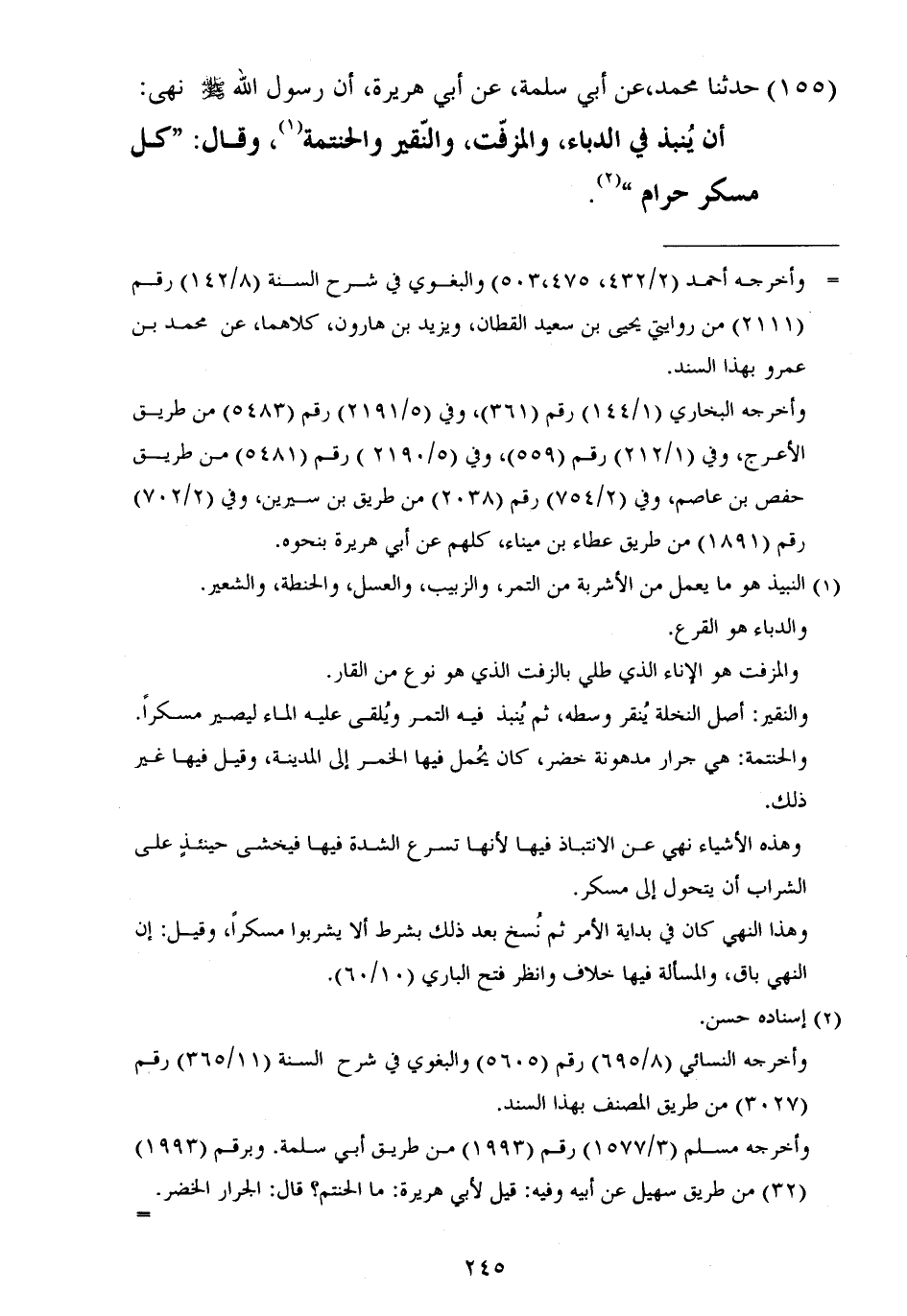 ١٥٥ - حَدَّثَنَا مُحَمَّدٌ، عَنْ أَبِي سَلَمَةَ، عَنْ أَبِي هُرَيْرَةَ أَنَّ رَسُولَ اللَّهِ صَلَّى اللهُ عَلَيْهِ وَسَلَّمَ نَهَى أَنْ يُنْبَذَ فِي الدُّبَّاءِ، وَالْمُزَفَّتِ، وَالنَّقِيرِ، وَالْحَنْتَمَةِ، وَقَالَ: «كُلُّ مُسْكِرٍ حَرَامٌ»