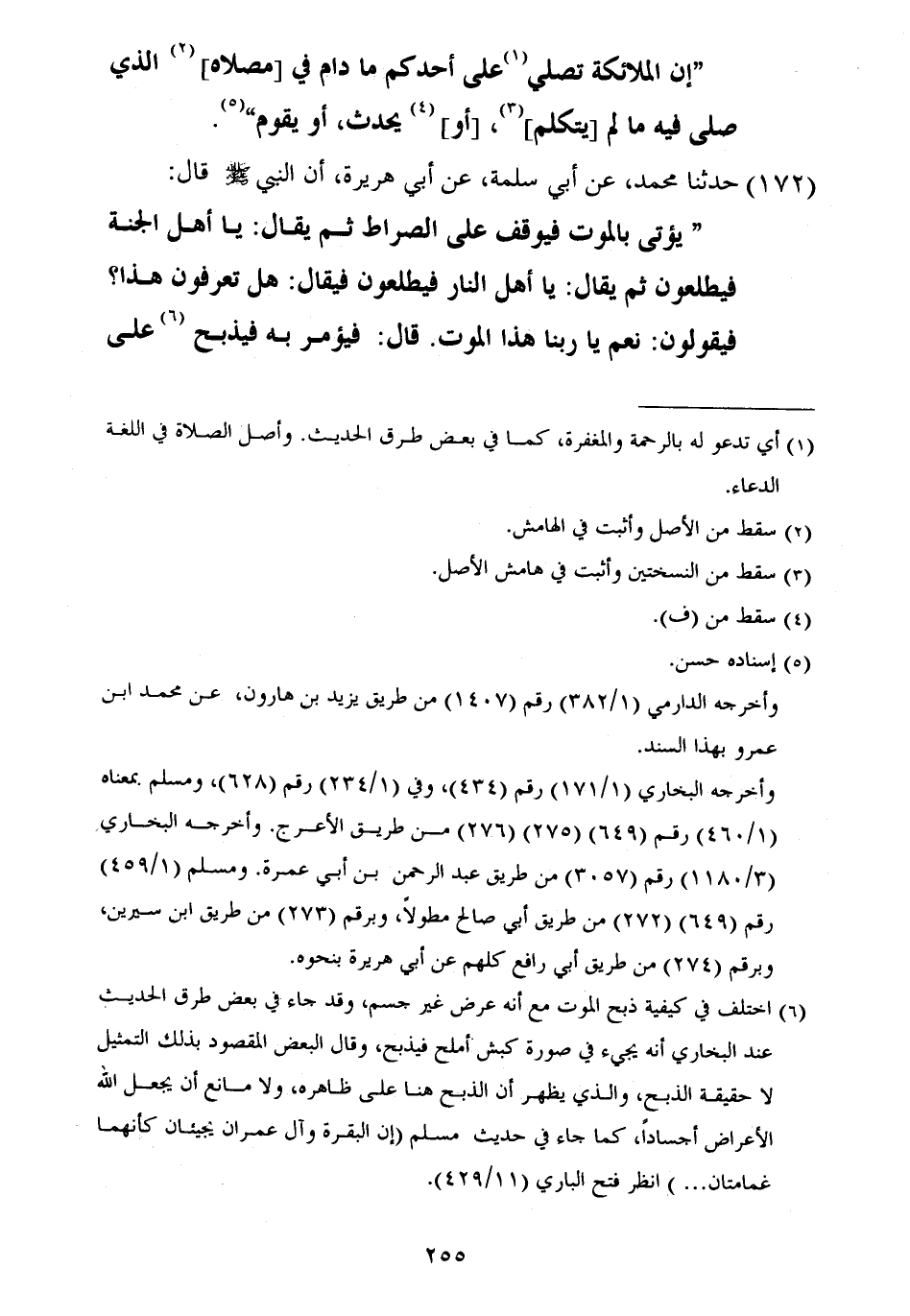 ١٧٢ - حَدَّثَنَا مُحَمَّدٌ، عَنْ أَبِي سَلَمَةَ، عَنْ أَبِي هُرَيْرَةَ أَنَّ النَّبِيَّ صَلَّى اللهُ عَلَيْهِ وَسَلَّمَ قَالَ: " يُؤْتَى بِالْمَوْتِ فَيُوقَفُ عَلَى الصِّرَاطِ، ثُمَّ يُقَالُ: يَا أَهْلَ الْجَنَّةِ فَيَطَّلِعُونَ، ثُمَّ يُقَالُ: يَا أَهْلَ النَّارِ، فَيَطَّلِعُونَ، فَيُقَالُ: هَلْ تَعْرِفُونَ هَذَا؟ فَيَقُولُونَ: نَعَمْ يَا رَبَّنَا، هَذَا الْمَوْتُ " قَالَ: " فَيُؤْمَرُ بِهِ فَيُذْبَحُ عَلَى ⦗٢٥٦⦘ الصِّرَاطِ، ثُمَّ يُقَالُ لِلْفَرِيقَيْنِ: خُلُودٌ فِيمَا تَجِدُونَ، لَا مَوْتَ فِيهَا أَبَدًا "