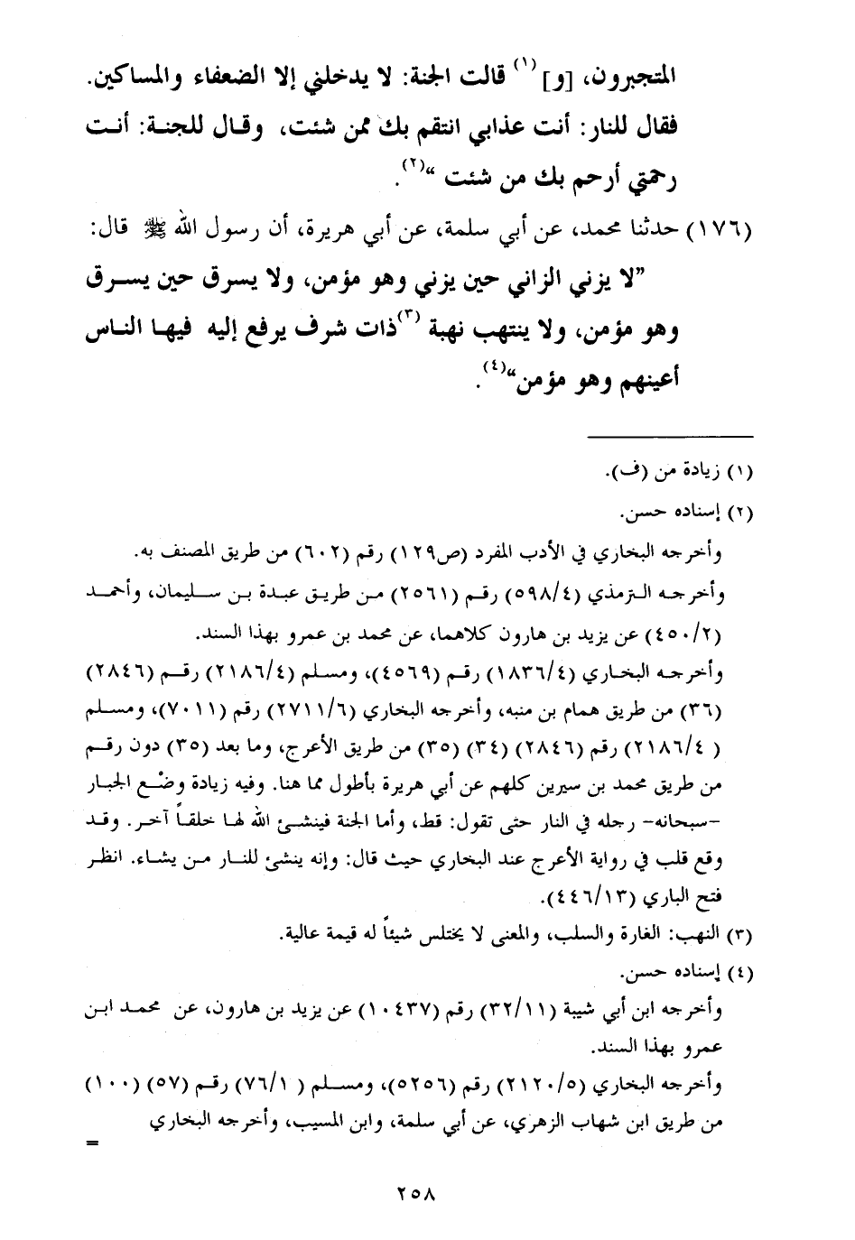 ١٧٦ - حَدَّثَنَا مُحَمَّدٌ، عَنْ أَبِي سَلَمَةَ، عَنْ أَبِي هُرَيْرَةَ أَنَّ رَسُولَ اللَّهِ صَلَّى اللهُ عَلَيْهِ وَسَلَّمَ قَالَ: «لَا يَزْنِي الزَّانِي حِينَ يَزْنِي وَهُو مُؤْمِنٌ، وَلَا يَسْرِقُ حِينَ يَسْرِقُ وَهُوَ مُؤْمِنٌ، وَلَا يَنْتَهِبُ نُهْبَةً ذَاتَ شَرَفٍ يَرْفَعُ إِلَيْهِ فِيهَا النَّاسُ أَعْيُنَهُمْ وَهُوَ مُؤْمِنٌ»