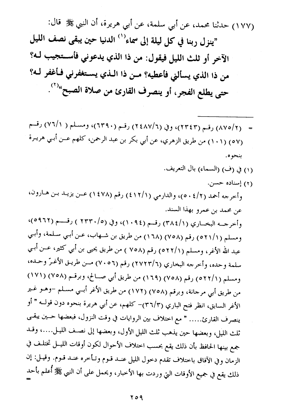 ١٧٧ - حَدَّثَنَا مُحَمَّدٌ، عَنْ أَبِي سَلَمَةَ، عَنْ أَبِي هُرَيْرَةَ أَنَّ النَّبِيَّ صَلَّى اللهُ عَلَيْهِ وَسَلَّمَ قَالَ: " يَنْزِلُ رَبُّنَا فِي كُلِّ لَيْلَةٍ إِلَى سَمَاءِ الدُّنْيَا حِينَ يَبْقَى نِصْفُ اللَّيْلِ الْآخِرُ، أَوْ ثُلُثُ اللَّيْلِ، فَيَقُولُ: مَنْ ذَا الَّذِي يَدْعُونِي فَأَسْتَجِيبَ لَهُ؟ مَنْ ذَا الَّذِي يَسْأَلُنِي فَأُعْطِيَهُ؟ مَنْ ذَا الَّذِي يَسْتَغْفِرُنِي فَأَغْفِرَ لَهُ؟ حَتَّى يَطْلُعَ الْفَجْرُ، أَوْ يَنْصَرِفَ الْقَارِئُ مِنْ صَلَاةِ الصُّبْحِ "
