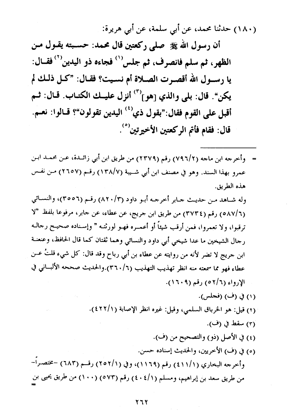 ١٨٠ - حَدَّثَنَا مُحَمَّدٌ، عَنْ أَبِي سَلَمَةَ، عَنْ أَبِي هُرَيْرَةَ أَنَّ رَسُولَ اللَّهِ صَلَّى اللهُ عَلَيْهِ وَسَلَّمَ صَلَّى رَكْعَتَيْنِ "، قَالَ مُحَمَّدٌ: حَسِبْتُهُ يَقُولُ: مِنَ الظُّهْرِ، ثُمَّ سَلَّمَ فَانْصَرَفَ، ثُمَّ جَلَسَ فَجَاءَهُ ذُو الْيَدَيْنِ فَقَالَ: يَا رَسُولَ اللَّهِ، أَقُصِرَتِ الصَّلَاةُ أَمْ نَسِيتَ؟ فَقَالَ: «كُلُّ ذَلِكَ لَمْ يَكُنْ» قَالَ: بَلَى، وَالَّذِي هُوَ أَنْزَلَ عَلَيْكَ الْكِتَابَ قَالَ: ثُمَّ أَقْبَلَ عَلَى الْقَوْمِ فَقَالَ: «بِقَوْلِ ذِي الْيَدَيْنِ تَقُولُونَ؟» قَالُوا: نَعَمْ قَالَ: فَقَامَ فَأَتَمَّ الرَّكْعَتَيْنِ الْأَخِيرَتَيْنِ