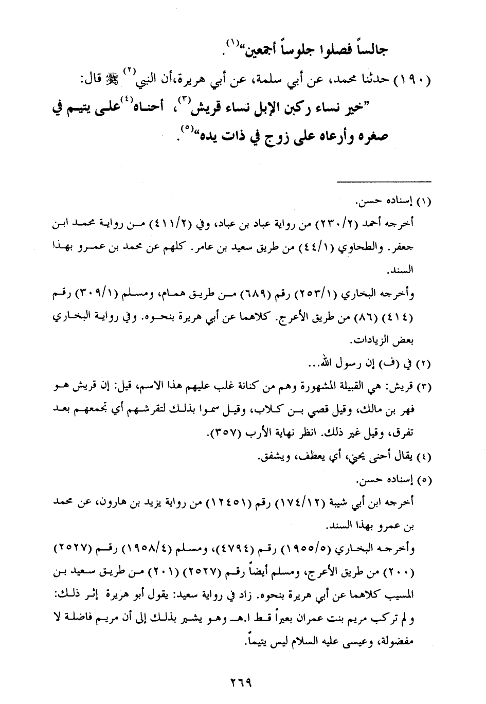 ١٩٠ - حَدَّثَنَا مُحَمَّدٌ، عَنْ أَبِي سَلَمَةَ، عَنْ أَبِي هُرَيْرَةَ أَنَّ النَّبِيَّ صَلَّى اللهُ عَلَيْهِ وَسَلَّمَ قَالَ: «خَيْرُ نِسَاءٍ رَكِبْنَ الْإِبِلَ نِسَاءُ قُرَيْشٍ، أَحْنَاهُ عَلَى يَتِيمٍ فِي صِغَرِهِ، وَأَرْعَاهُ عَلَى زَوْجٍ فِي ذَاتِ يَدِهِ»