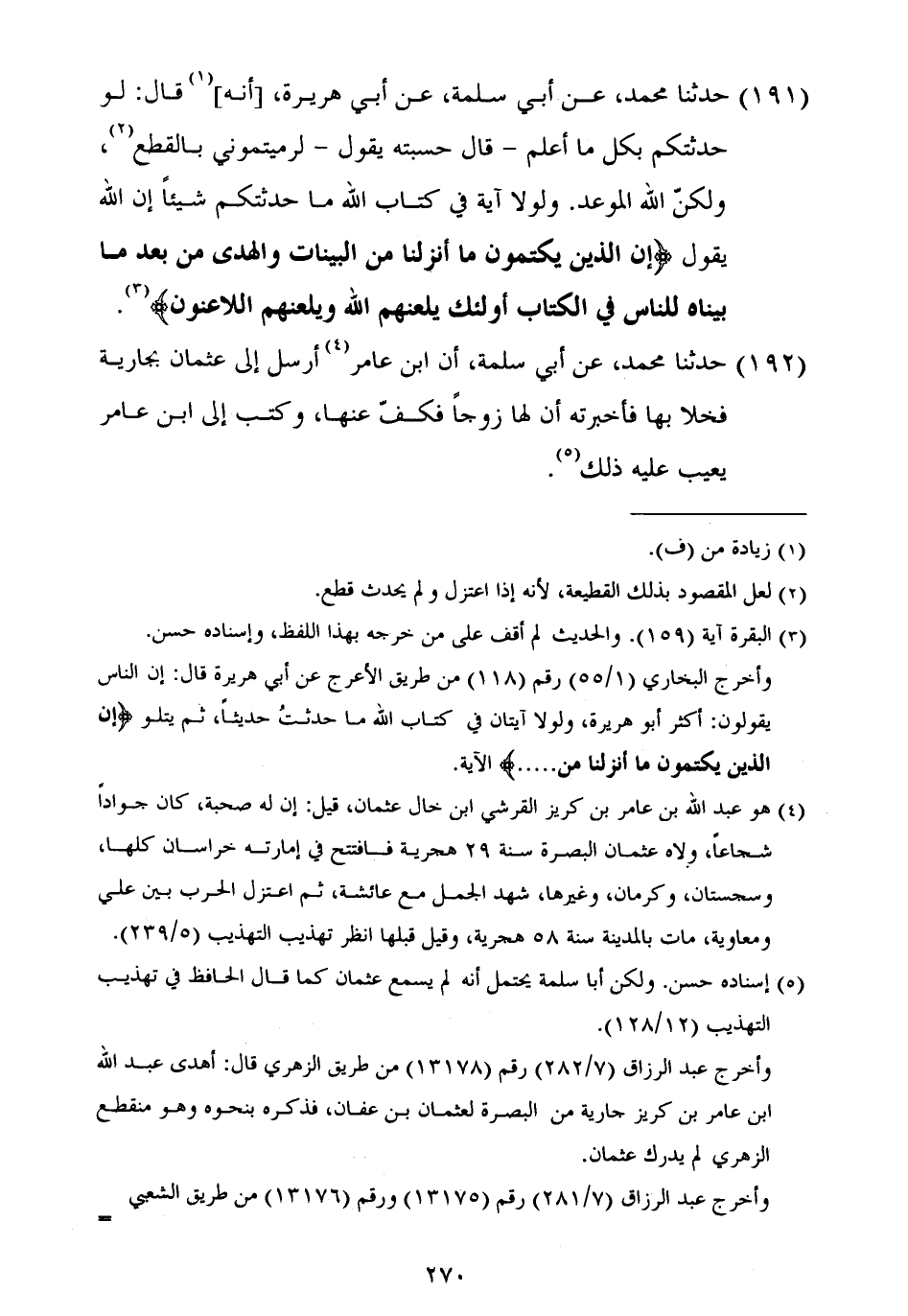 ١٩١ - حَدَّثَنَا مُحَمَّدٌ، عَنْ أَبِي سَلَمَةَ، عَنْ أَبِي هُرَيْرَةَ، أَنَّهُ قَالَ: «لَوْ حَدَّثْتُكُمْ بِكُلِّ مَا أَعْلَمُ» قَالَ حَسِبْتُهُ يَقُولُ: لَرَمَيْتُمُونِي بِالْقَطْعِ " وَلَكِنَّ اللَّهَ الْمَوْعِدُ، وَلَوْلَا آيَةٌ فِي كِتَابِ اللَّهِ مَا حَدَّثْتُكُمْ شَيْئًا؛ إِنَّ اللَّهَ يَقُولُ {إِنَّ الَّذِينَ يَكْتُمُونَ مَا أَنْزَلْنَا مِنَ الْبَيِّنَاتِ وَالْهُدَى مِنْ بَعْدِ مَا بَيَّنَّاهُ لِلنَّاسِ فِي الْكِتَابِ أُولَئِكَ يَلْعَنُهُمُ اللَّهُ وَيَلْعَنُهُمُ اللَّاعِنُونَ} [البقرة: ١٥٩] "