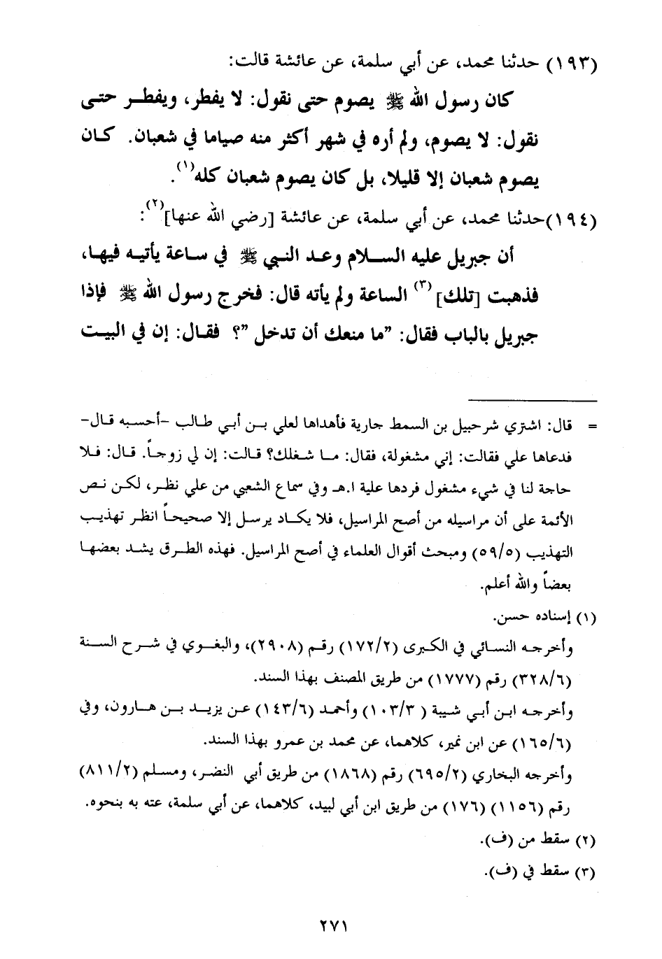 ١٩٣ - حَدَّثَنَا مُحَمَّدٌ، عَنْ أَبِي سَلَمَةَ، عَنْ عَائِشَةَ، قَالَتْ: " كَانَ رَسُولُ اللَّهِ صَلَّى اللهُ عَلَيْهِ وَسَلَّمَ يَصُومُ حَتَّى نَقُولَ: لَا يُفْطِرُ، وَيُفْطِرُ حَتَّى نَقُولَ: لَا يَصُومُ، وَلَمْ أَرَهُ فِي شَهْرٍ أَكْثَرَ مِنْهُ صِيَامًا فِي شَعْبَانَ كَانَ يَصُومُ شَعْبَانَ إِلَّا قَلِيلًا، بَلْ كَانَ يَصُومُ شَعْبَانَ كُلَّهُ "