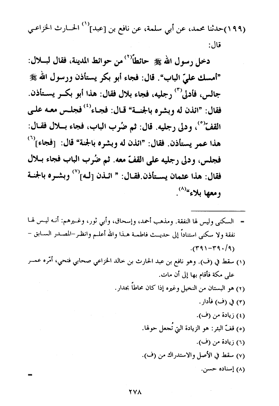 ١٩٩ - حَدَّثَنَا مُحَمَّدٌ، عَنْ أَبِي سَلَمَةَ، عَنْ نَافِعِ بْنِ عَبْدِ الْحَارِثِ الْخُزَاعِيِّ، قَالَ: دَخَلَ رَسُولُ اللَّهِ صَلَّى اللهُ عَلَيْهِ وَسَلَّمَ حَائِطًا مِنْ حَوَائِطِ الْمَدِينَةِ، فَقَالَ لِبِلَالٍ: «أَمْسِكْ عَلَيَّ الْبَابَ» قَالَ: فَجَاءَ أَبُو بَكْرٍ يَسْتَأْذِنُ، وَرَسُولُ اللَّهِ صَلَّى اللهُ عَلَيْهِ وَسَلَّمَ جَالِسٌ، فَأَدْلَى رِجْلَيْهِ، فَجَاءَ بِلَالٌ فَقَالَ: هَذَا أَبُو بَكْرٍ يَسْتَأْذِنُ فَقَالَ: «ائْذَنْ لَهُ وَبَشِّرْهُ بِالْجَنَّةِ» قَالَ: فَجَاءَ فَجَلَسَ مَعَهُ عَلَى الْقُفِّ، وَدَلَّى رِجْلَيْهِ قَالَ: ثُمَّ ضُرِبَ الْبَابُ، فَجَاءَ بِلَالٌ فَقَالَ: هَذَا عُمَرُ يَسْتَأْذِنُ فَقَالَ: «ائْذَنْ لَهُ وَبَشِّرْهُ بِالْجَنَّةِ» قَالَ: فَجَاءَ فَجَلَسَ، وَدَلَّى رِجْلَيْهِ عَلَى الْقُفِّ مَعَهُ، ثُمَّ ضُرِبَ الْبَابُ فَجَاءَ بِلَالٌ فَقَالَ: هَذَا عُثْمَانُ يَسْتَأْذِنُ فَقَالَ: «ائْذَنْ لَهُ وَبَشِّرْهُ بِالْجَنَّةِ وَمَعَهَا بَلَاءٌ»