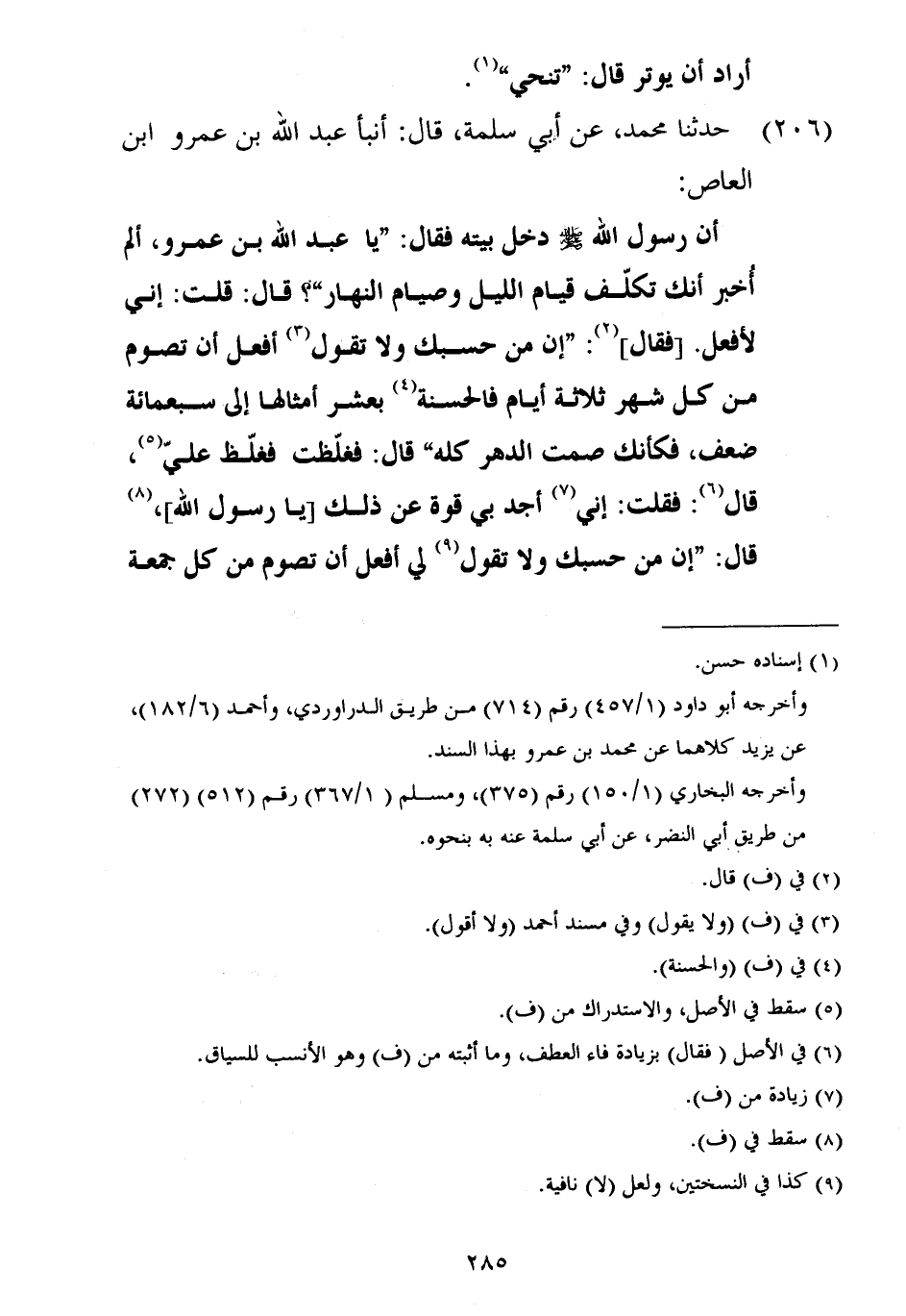 ٢٠٦ - حَدَّثَنَا مُحَمَّدٌ، عَنْ أَبِي سَلَمَةَ، قَالَ: أنبأ عَبْدُ اللَّهِ بْنُ عَمْرِو بْنِ الْعَاصِ أَنَّ رَسُولَ اللَّهِ صَلَّى اللهُ عَلَيْهِ وَسَلَّمَ دَخَلَ بَيْتَهُ فَقَالَ: «يَا عَبْدَ اللَّهِ بْنَ عَمْرٍو أَلَمْ أُخْبَرْ أَنَّكَ تَكَلَّفُ قِيَامَ اللَّيْلِ وَصِيَامَ النَّهَارِ؟» قَالَ: قُلْتُ: إِنِّي لَأَفْعَلُ فَقَالَ: «إِنَّ مِنْ حَسْبِكَ وَلَا تَقُولُ أَفْعَلُ أَنْ تَصُومَ مِنْ كُلِّ شَهْرٍ ثَلَاثَةَ أَيَّامٍ فَالْحَسَنَةُ بِعَشْرِ أَمْثَالِهَا إِلَى سَبْعِمِائَةِ ضِعْفٍ، فَكَأَنَّكَ صُمْتَ الدَّهْرَ كُلَّهُ» قَالَ: فَغَلَّظْتُ فَغُلِّظَ عَلَيَّ، قَالَ: فَقُلْتُ: إِنِّي أَجِدُ بِي قُوَّةً عَنْ ذَلِكَ يَا رَسُولَ اللَّهِ، قَالَ: «إِنَّ مِنْ حَسْبِكَ وَلَا تَقُولُ لِي أَفْعَلُ أَنْ تَصُومَ مِنْ كُلِّ جُمُعَةٍ ⦗٢٨٦⦘ ثَلَاثَةَ أَيَّامٍ» قَالَ: فَغَلَّظْتُ فَغُلِّظَ عَلَيَّ، قَالَ فَقُلْتُ: إِنِّي لَأَجِدُ قُوَّةً عَنْ ذَلِكَ، فَقَالَ: «إِنَّ أَعْدَلَ الصِّيَامِ عِنْدَ اللَّهِ نِصْفُ الدَّهْرِ صَوْمُ دَاوُدَ، إِنَّ لِعَيْنَيْكَ عَلَيْكَ حَقًّا، وَلِأَهْلِكَ عَلَيْكَ حَقًّا، وَإِنَّ لِضَيْفِكَ عَلَيْكَ حَقًّا» ، قَالَ أَبُو سَلَمَةَ: وَكَانَ عَبْدُ اللَّهِ بْنُ عَمْرٍو يَقُولُ بَعْدَ أَنْ أَدْرَكَتْهُ السِّنُّ وَضَعُفَ: لَأَنْ أَكُونَ قَبِلْتُ رُخْصَةَ رَسُولِ اللَّهِ صَلَّى اللهُ عَلَيْهِ وَسَلَّمَ أَحَبُّ إِلَيَّ مِنْ أَهْلِي وَمَالِي