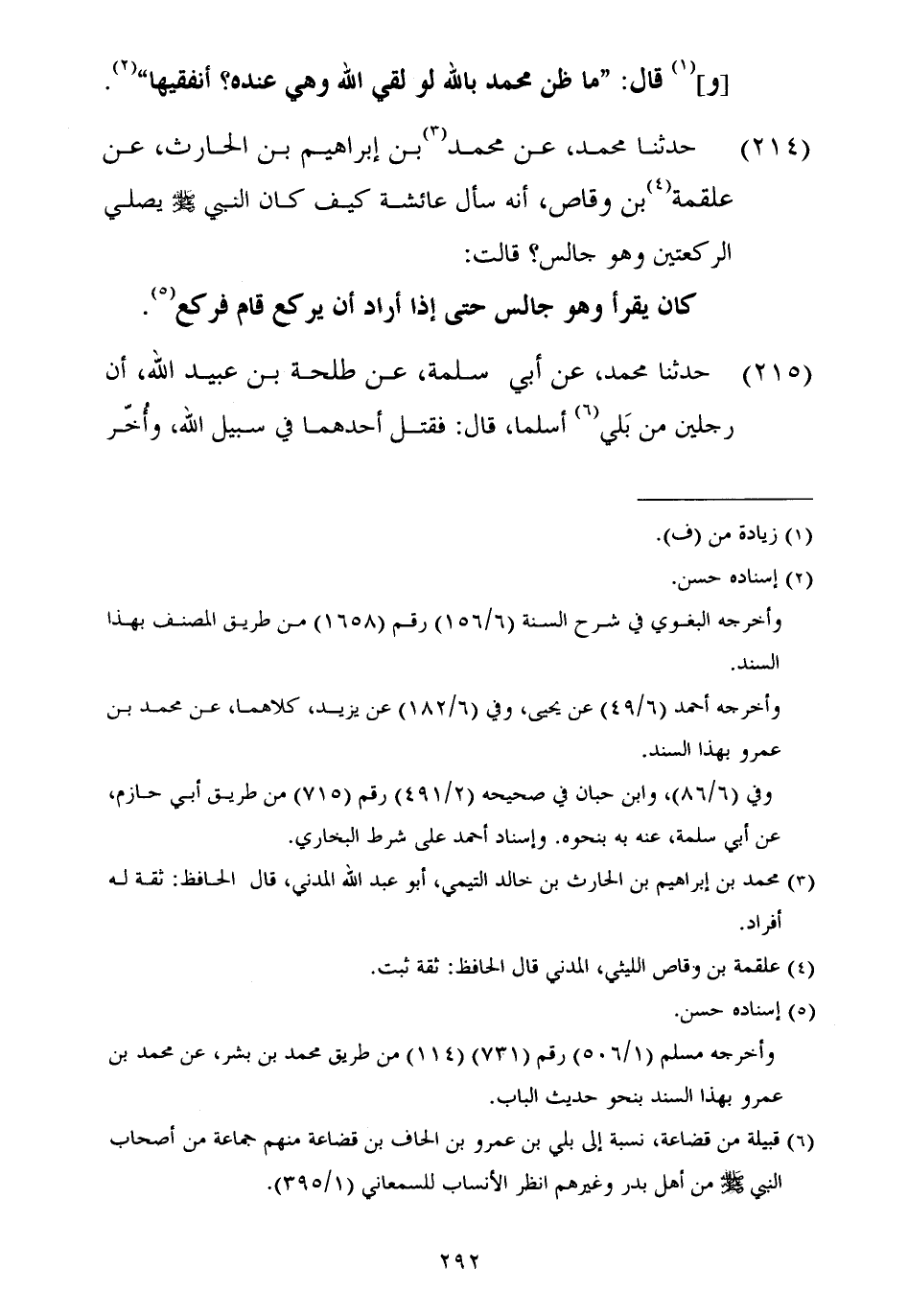 ٢١٥ - حَدَّثَنَا مُحَمَّدٌ، عَنْ أَبِي سَلَمَةَ، عَنْ طَلْحَةَ بْنِ عُبَيْدِ اللَّهِ أَنَّ رَجُلَيْنِ مِنْ بَلِيٍّ أَسْلَمَا، قَالَ: فَقُتِلَ أَحَدُهُمَا فِي سَبِيلِ اللَّهِ، وَأُخِّرَ ⦗٢٩٣⦘ الْآخَرُ بَعْدَ الْمَقْتُولِ سَنَةً ثُمَّ مَاتَ، قَالَ طَلْحَةُ: فَرَأَيْتُ الْجَنَّةَ فِي الْمَنَامِ، فَرَأَيْتُ الْآخَرَ مِنَ الرَّجُلَيْنِ أُدْخِلَ الْجَنَّةَ قَبْلَ الْأَوَّلِ فَأَصْبَحْتُ فَحَدَّثْتُ النَّاسَ بِذَلِكَ فَبَلَغَ ذَلِكَ رَسُولَ اللَّهِ صَلَّى اللهُ عَلَيْهِ وَسَلَّمَ فَقَالَ: «أَلَيْسَ قَدْ صَامَ بَعْدَهُ رَمَضَانَ، وَصَلَّى بَعْدَهُ سَنَةً سِتَّةَ آلَافِ رَكْعَةٍ وَكَذَا وَكَذَا رَكْعَةً؟»