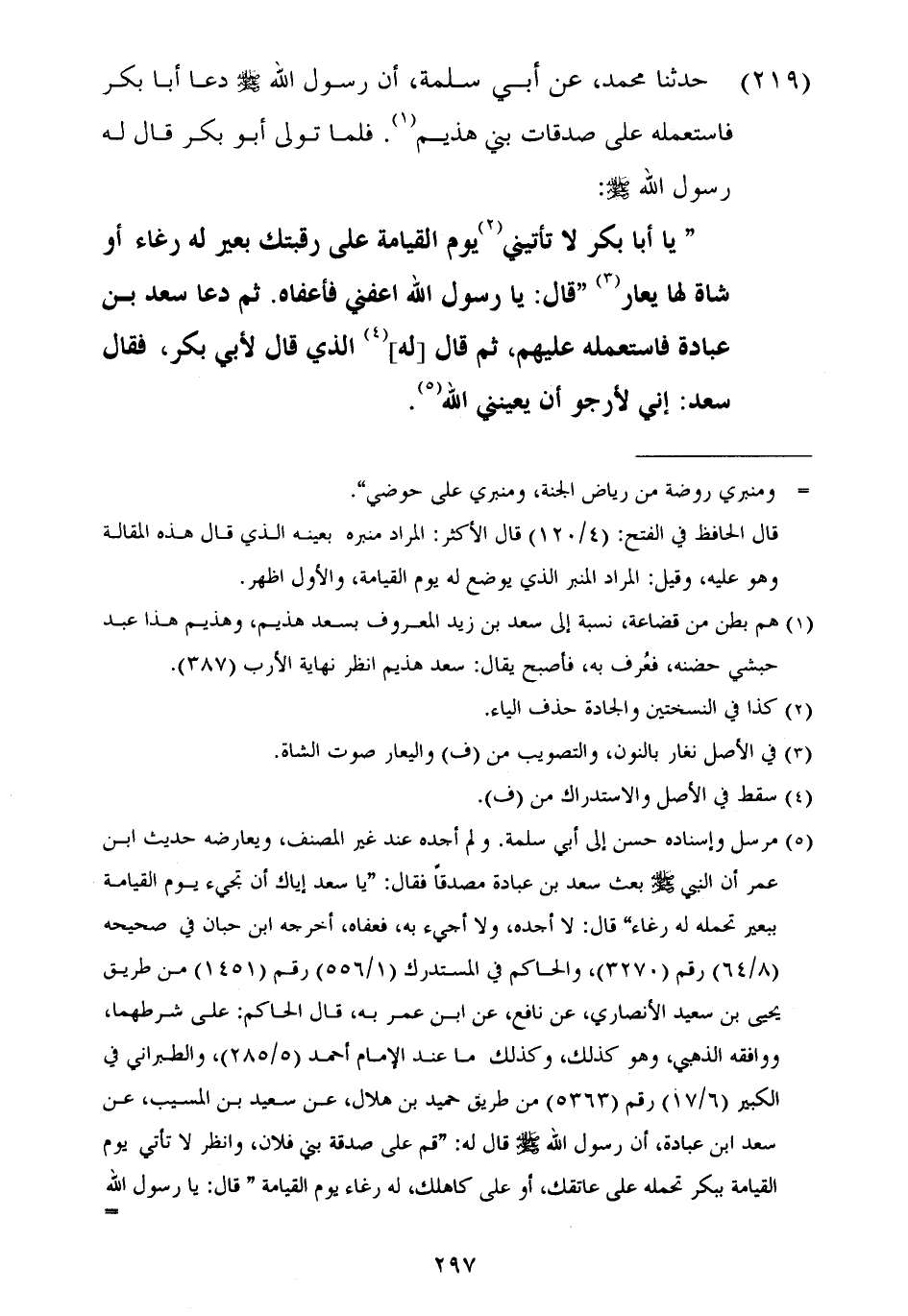٢١٩ - حَدَّثَنَا مُحَمَّدٌ، عَنْ أَبِي سَلَمَةَ أَنَّ رَسُولَ اللَّهِ صَلَّى اللهُ عَلَيْهِ وَسَلَّمَ دَعَا أَبَا بَكْرٍ فَاسْتَعْمَلَهُ عَلَى صَدَقَاتِ بَنِي هُذَيْمٍ فَلَمَّا تَوَلَّى أَبُو بَكْرٍ قَالَ لَهُ رَسُولُ اللَّهِ صَلَّى اللهُ عَلَيْهِ وَسَلَّمَ: «يَا أَبَا بَكْرٍ لَا تَأْتِيَنِي يَوْمَ الْقِيَامَةِ عَلَى رَقَبَتِكَ بَعِيرٌ لَهُ رُغَاءٌ، أَوْ شَاةٌ لَهَا يُعَارٌ» قَالَ: يَا رَسُولَ اللَّهِ اعْفِنِي فَأَعْفَاهُ، ثُمَّ دَعَا سَعْدَ بْنَ عُبَادَةَ فَاسْتَعْمَلَهُ عَلَيْهِمْ، ثُمَّ قَالَ لَهُ الَّذِي قَالَ لِأَبِي بَكْرٍ، فَقَالَ سَعْدٌ: إِنِّي لَأَرْجُوَ أَنْ يُعِينَنِي اللَّهُ
