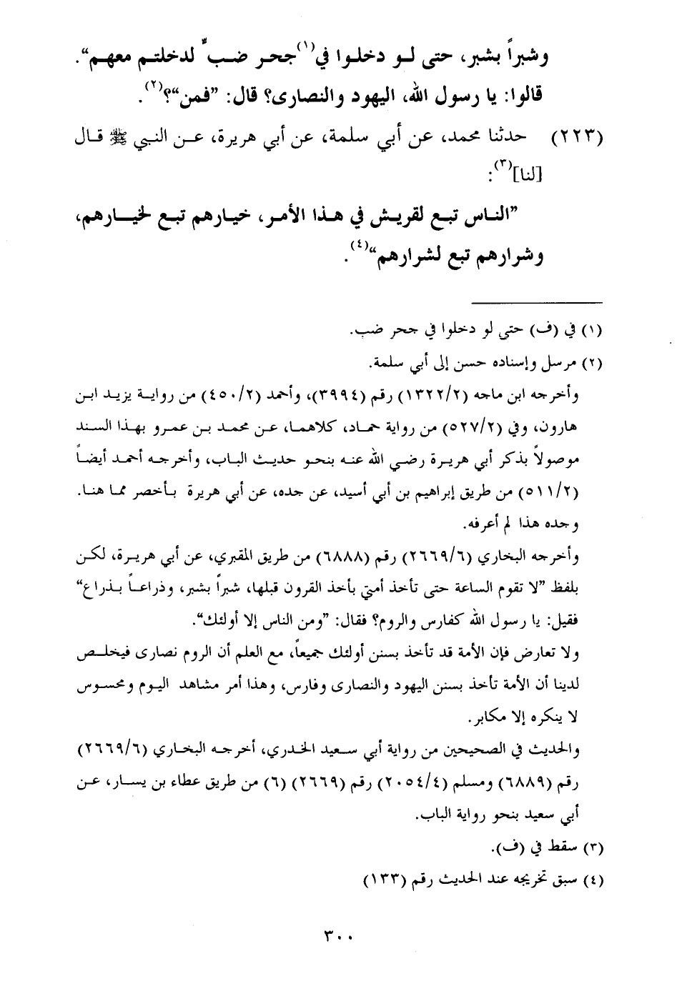 ٢٢٣ - حَدَّثَنَا مُحَمَّدٌ، عَنْ أَبِي سَلَمَةَ، عَنْ أَبِي هُرَيْرَةَ، عَنِ النَّبِيِّ صَلَّى اللهُ عَلَيْهِ وَسَلَّمَ قَالَ لَنَا: «النَّاسُ تَبَعٌ لِقُرَيْشٍ فِي هَذَا الْأَمْرِ، خِيَارُهُمْ تَبَعٌ لِخِيَارِهِمْ، وَشِرَارُهُمْ تَبَعٌ لِشِرَارِهِمْ»